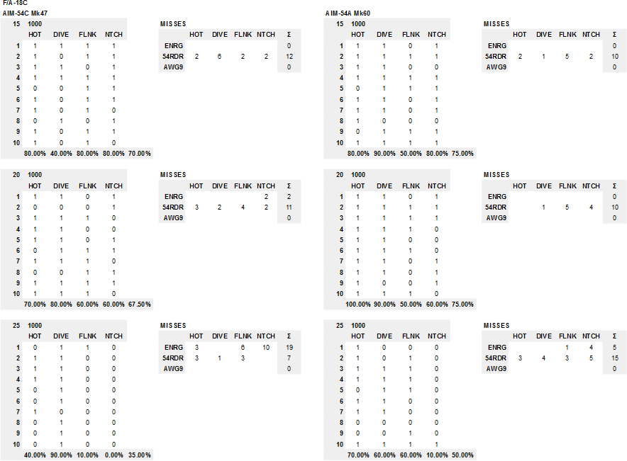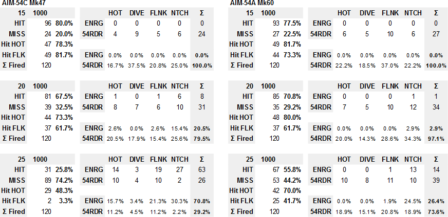 The interpolated Hit rate value of the AIM-54C Mk47 for Hot targets is ~60% at 23nm and increases faster as the target gets closer. This is a valuable information because it proves such missile to be a valid weapon; although the combined hit rate at such range is abysmal.
