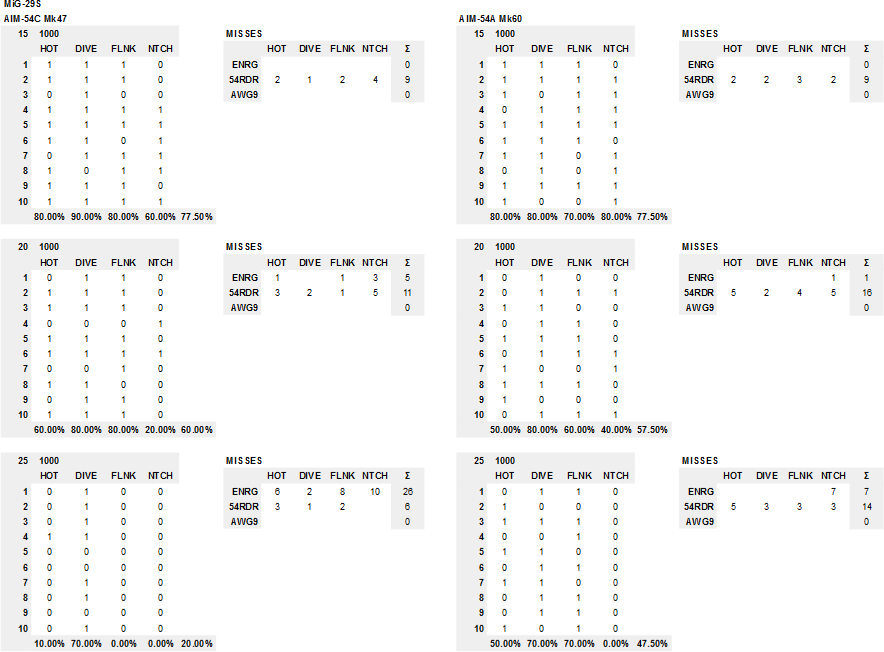 Something new appears in this test: a number of AIM-54 missed the target because they run out of energy. As we know from the AIM-54 Performance study, the altitude is pivotal in order to increase the range of a missile because at lower altitude the air is thicker, hence the friction is higher and it spends much more energy flying through it. This factor, added to the changes in the missile trajectory caused by the manoeuvres of the target, can bleed off the energy of the Phoenix energy very fast.