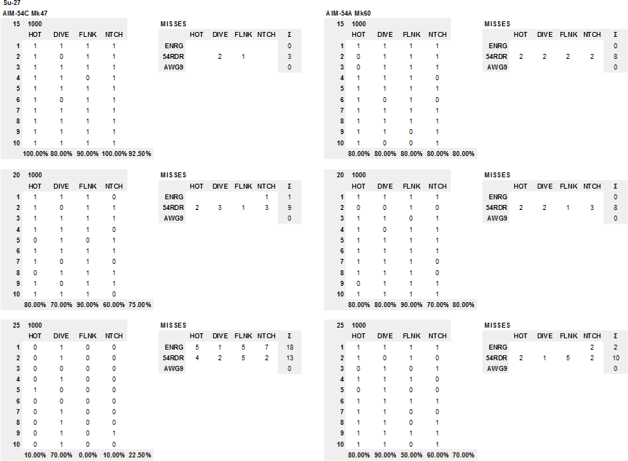By reviewing the Tacview, the odd defensive manoeuvre of the Su-27 appears clear: it turns towards the F-14, then notches and finally moves back. This has the effect of shortening the distance between the AIM-54 and the target itself and therefore is eventually counterproductive from the point of view of the defensive aircraft. Other aircraft, such as the MiG-29S, don’t fly as often towards the F-14 but rather away from it, and this is clearly proved by the melancholic 0% hit rate in this scenario.