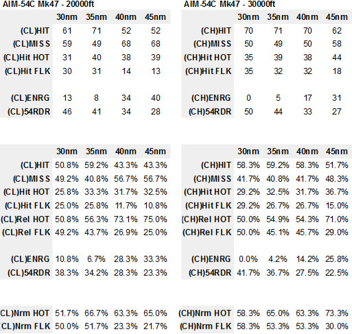 The increased performance of each version at 45nm, 30,000ft, especially for the AIM-54C Mk47, may be related to the odd case of the MiG-29S I cover later on. That aside, it is interesting to note how the results are fairly similar and consistent between 35nm and 45nm.