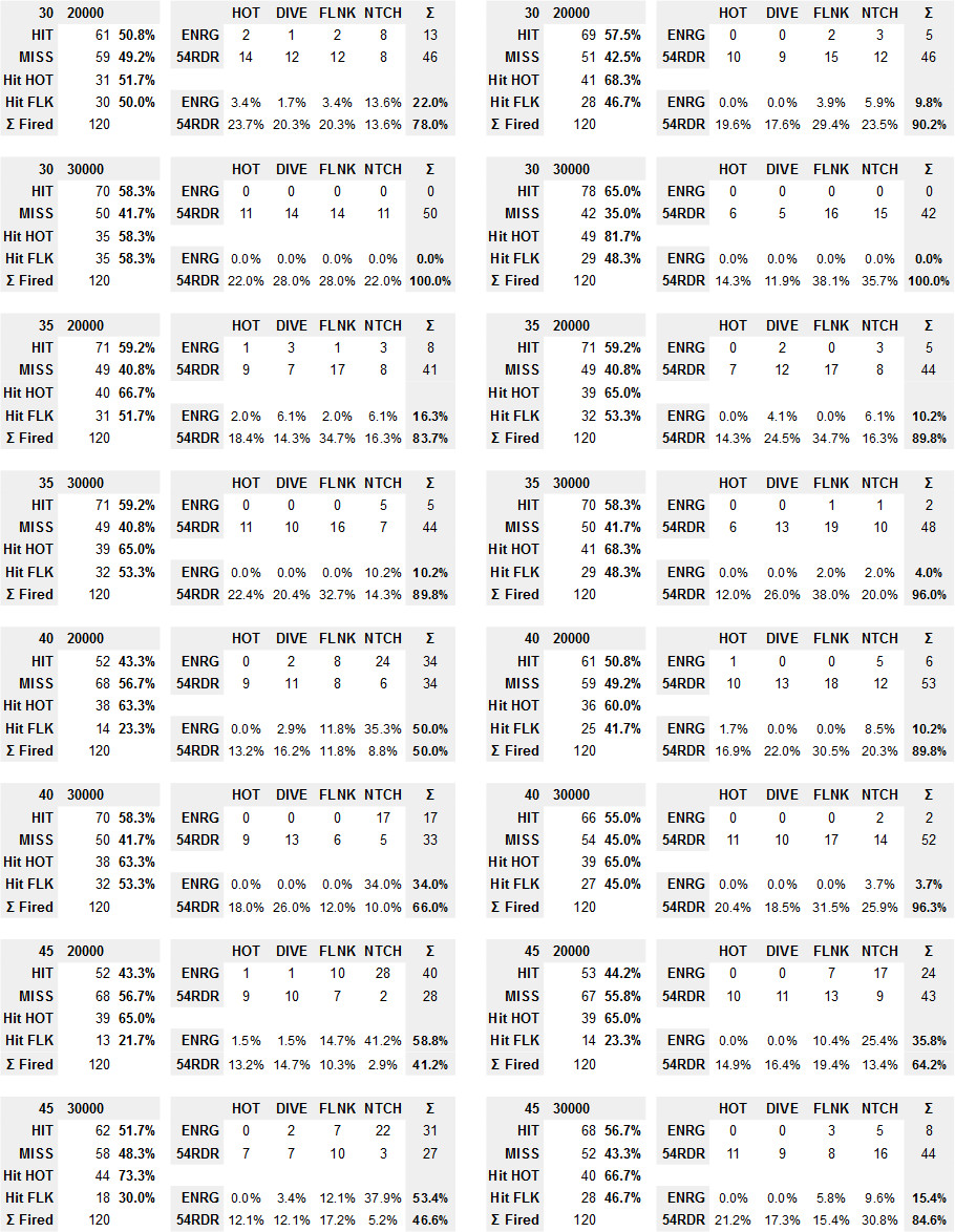 The following is the combined chart for the Hit Rates. As we know from the previous studies, it is the least meaningful because the PK changes so much as the altitude and aspect of the target change.