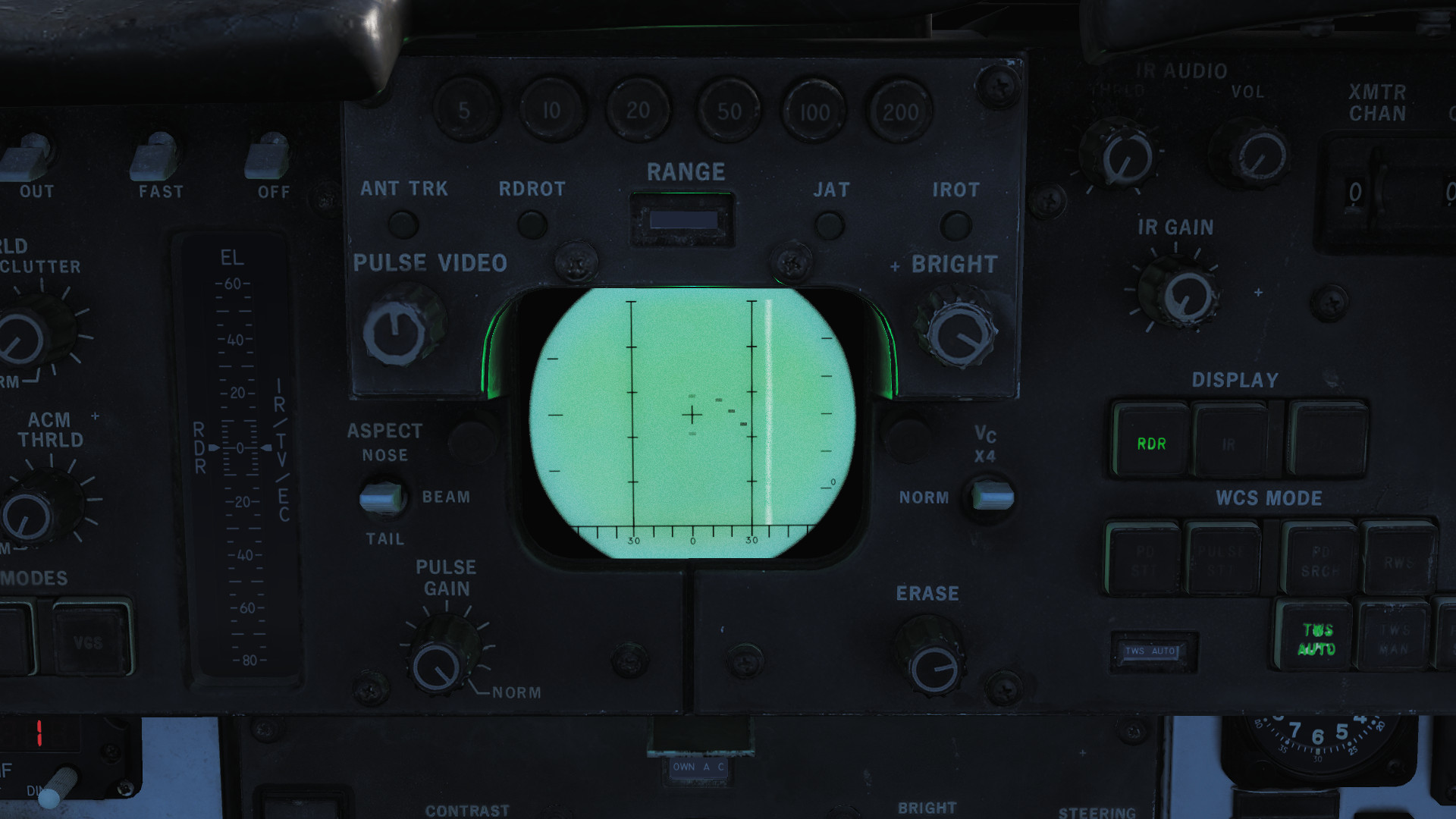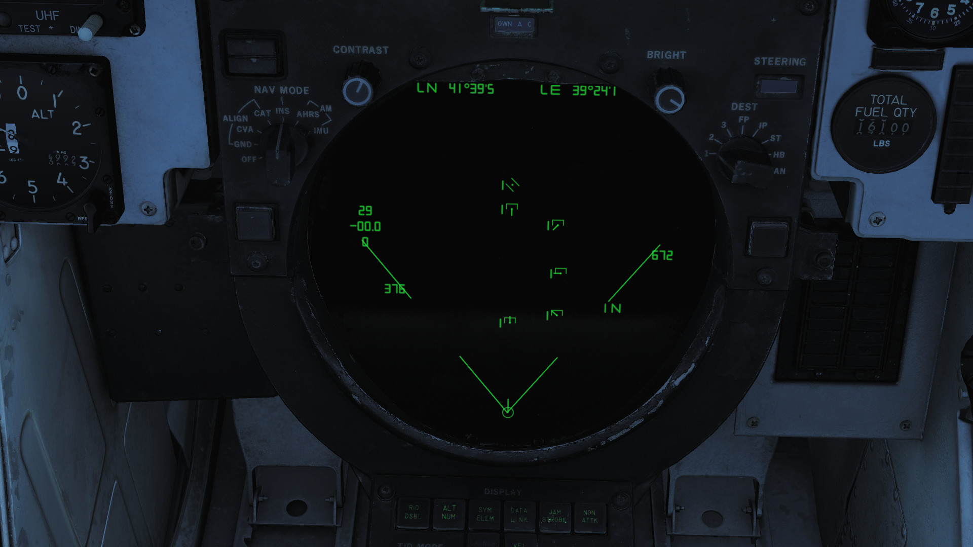 A neat function of the TID is the Offset (Controls→F-14B RIO→”HCU Offset”): if a part of an area we are interested in is, for instance, placed on the limits of the TV screen or out of such limits entirely, we can hook a more favourable position and press the Offset button to re-center the TID there (I used it in the very first picture to present a better view of the contacts).