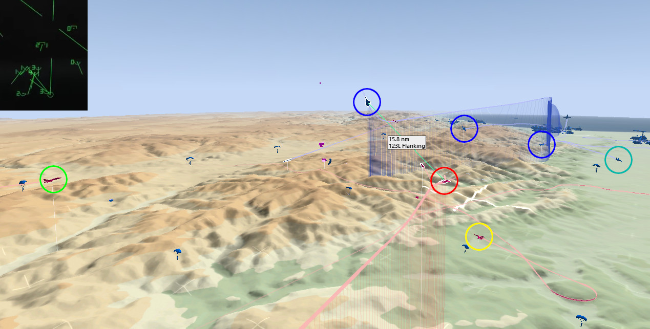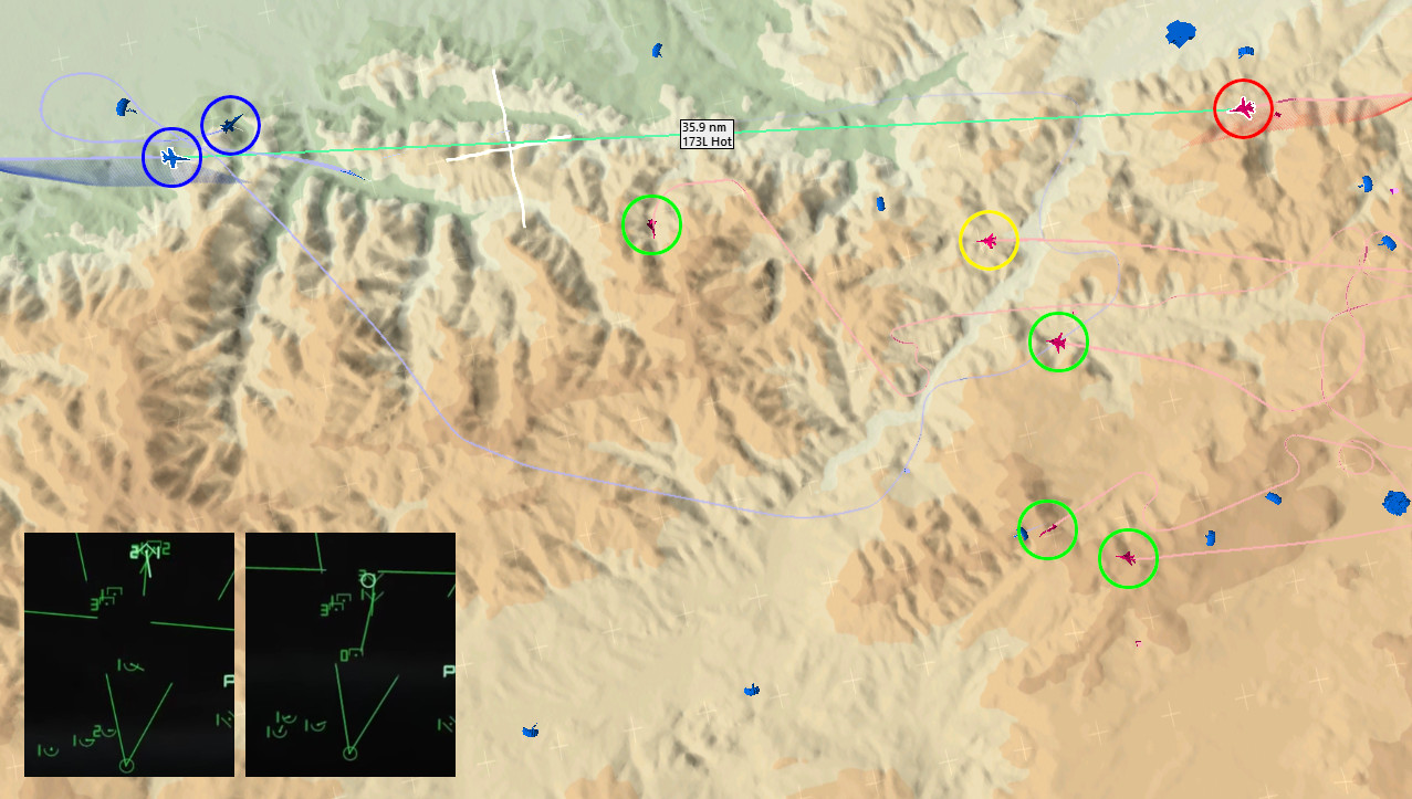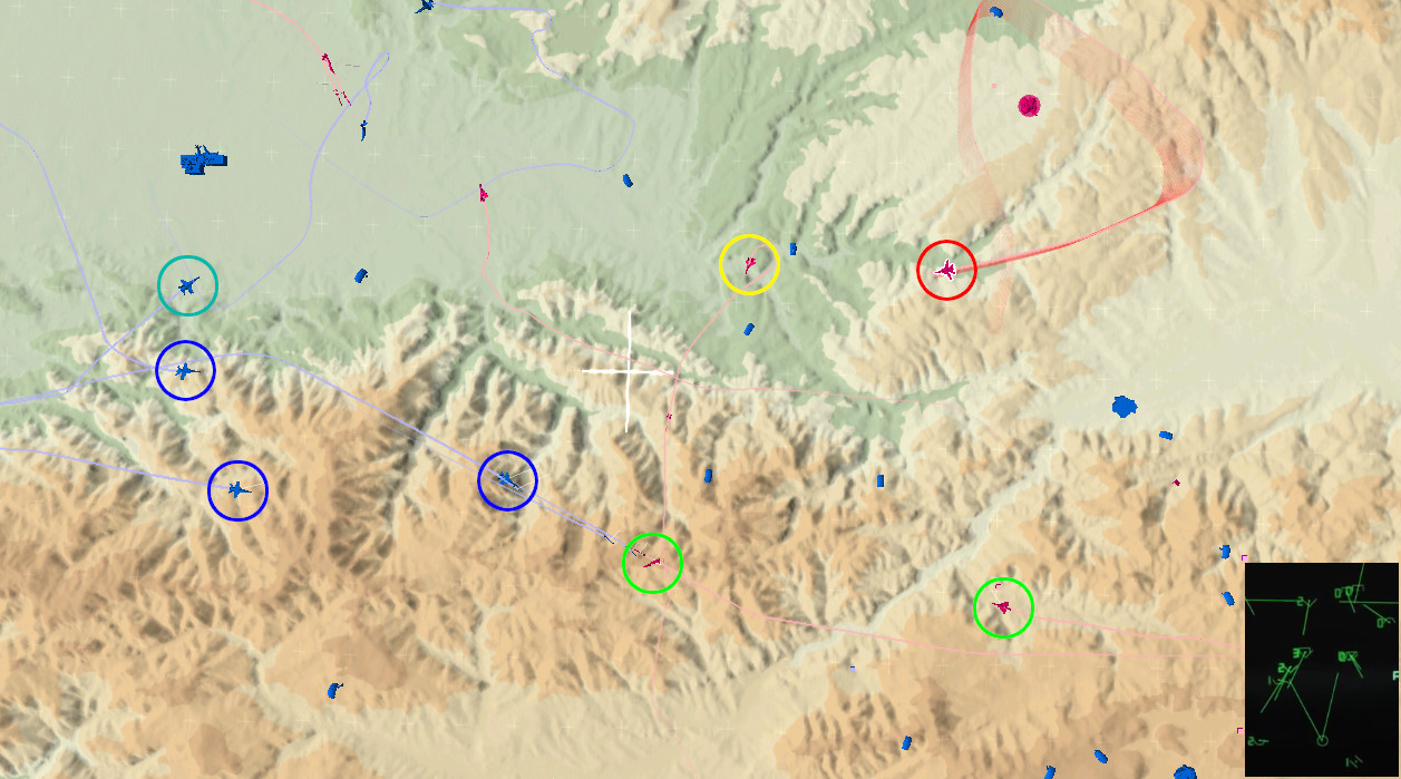 The Blue circles are the two hostile contacts I had on my TID. The four Green are the friendlies, either coming from the AWG-9 or the Datalink. The Yellow instead is a friendly that hasn’t been detected by the radar or the AWACS: it was out of the AWACS line of sight and was flying in the Zero Doppler Filter. This proves how, no matter AWACS, Datalink and AWG-9, sometimes the SA is not as good as we think.