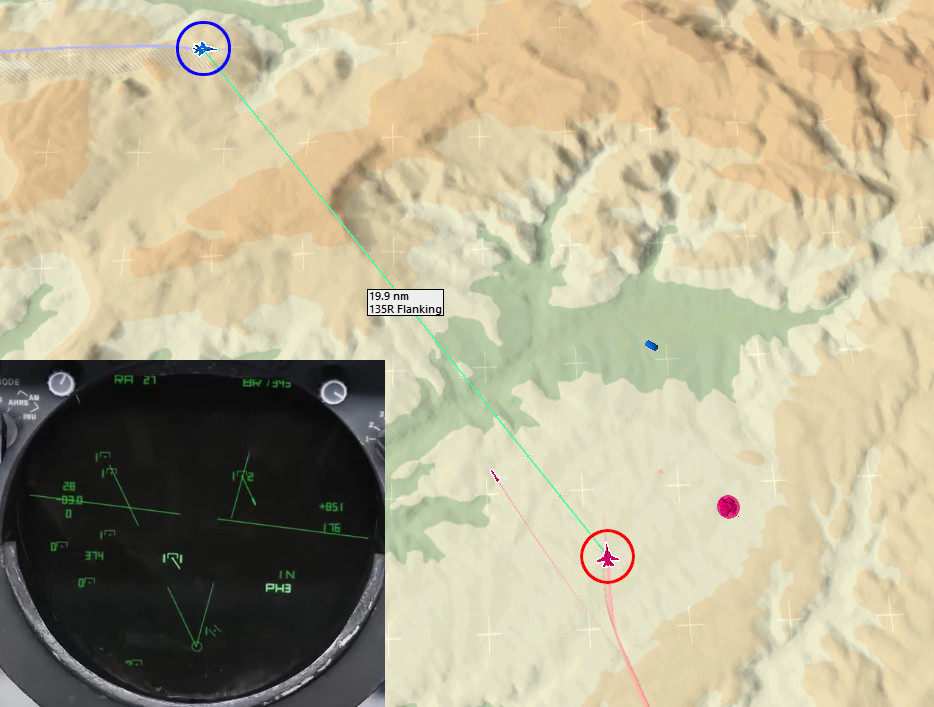 Here I lost my target: it was defending from a friendly R-73 and it went vertical, out of my radar cone. TWS Auto is not implemented yet so the antenna elevation does not compensate for the cranking manoeuvre I asked to the pilot. I found the target again only after having reactivated the DL on the TID. The hostile was flying above 35,000ft.