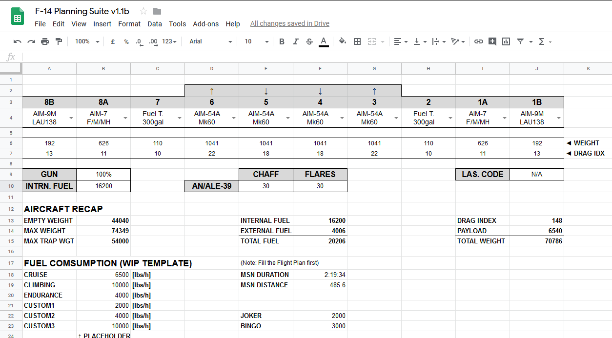 The first results of the model (5000ft to 25000ft) are present in the Payload page in the form of an IAS vs Fuel Flow chart (the Flow value is for a single engine!) for an ordnance configuration close to a standard CAP mission (4xAIM-54, 2xAIM-7, 2xAIM-9, Fuel Tanks and Gun).