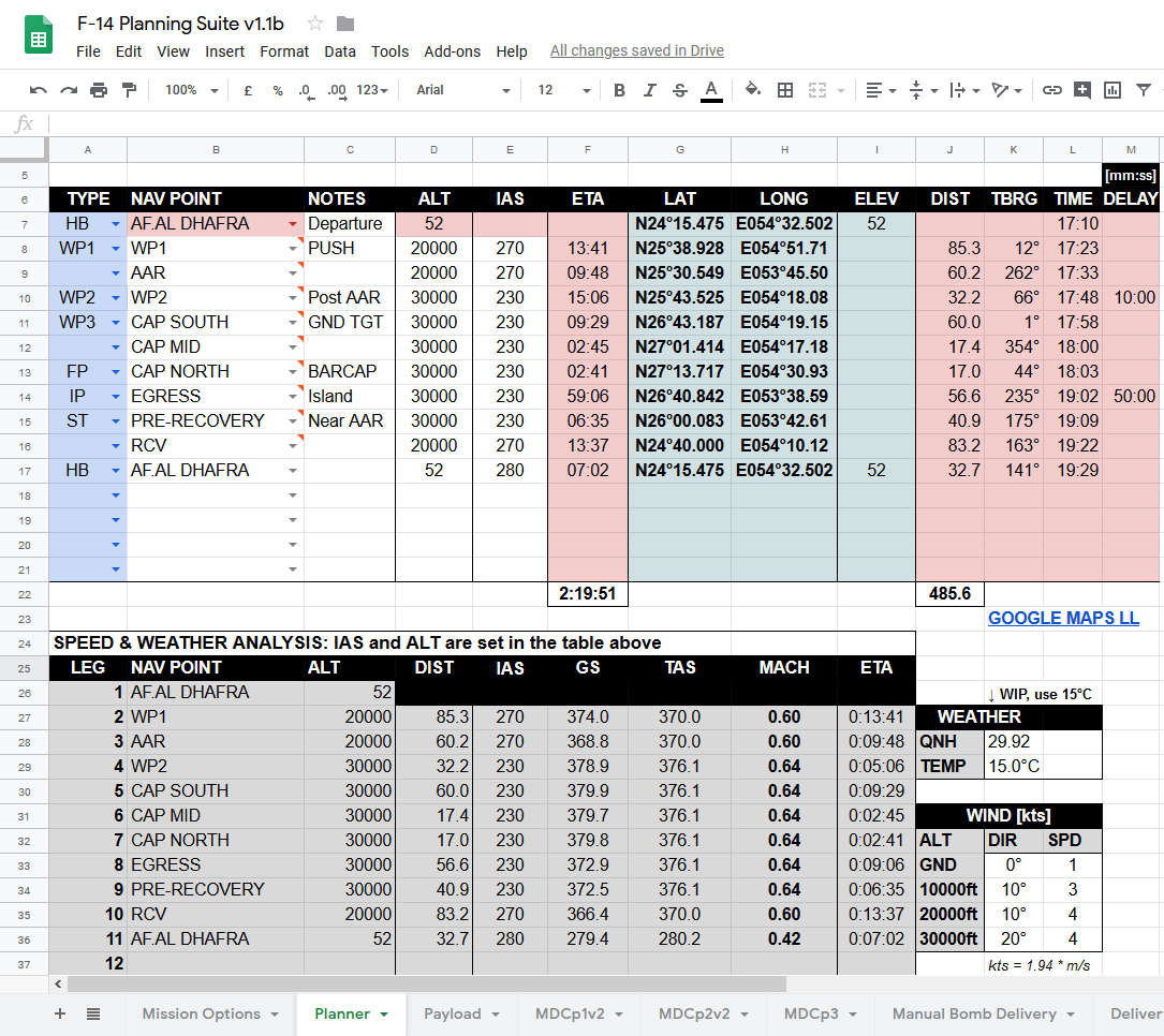 This is a very lengthy topic so, long story short, to get the TAS from IAS I used a JS algorithm I found online a while ago (unfortunately I didn’t save the source). I used a simplified NASA model (applicable for altitude < 36000) for the atmospheric temperature then Pythagoras to consider the Δ altitude between waypoints and again Pythagoras and trigonometry to add the wind. Unfortunately, not having access to DCS' actual implementation, I can only try to adjust different models and see which one gets closer to the in-game values.