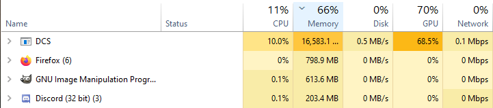 Fun fact: luckily I decided to get 64GB of RAM when I updated my PC. This is DCS running at mid-high details. Maxed out it can use even more RAM!