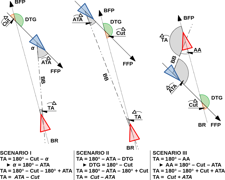 Scenario III resembles a Lag Pursuit and the usual intercept triangle is again not applicable. We notice that the triangle’s angles are AA, Cut and ATA: