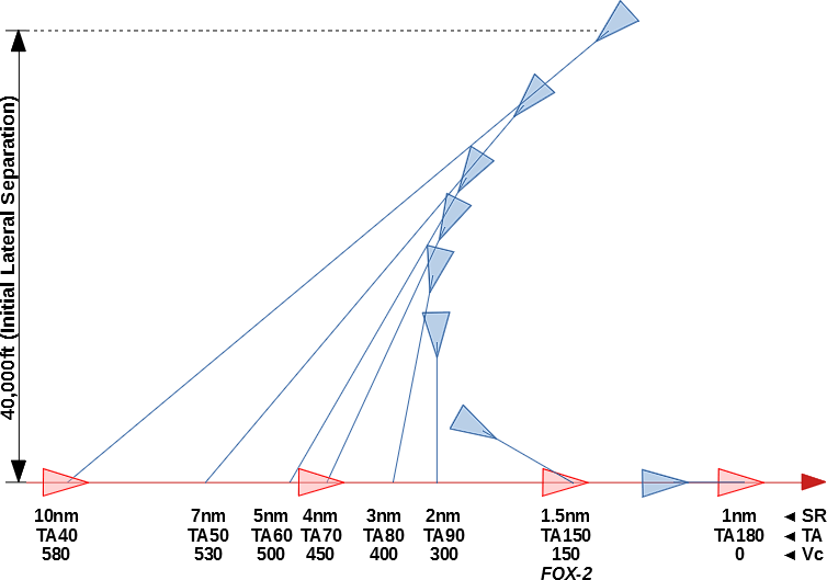 The Lateral Separation at 10nm with 50TA is 50,000 ft, 10k in excess that should have been corrected during the collision phase or with a DT. - The Conversion Turn into the bandit’s RQ happens as expected: initially easy, later harder; but the ΔV must be taken into account to avoid overshooting;
