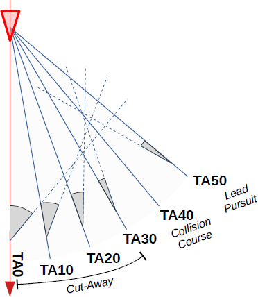 Another example, with TA = 10, LS = 10,000. The fighter needs to generate an additional 30,000 of LS by turning to place the target at 30 ATA cold.