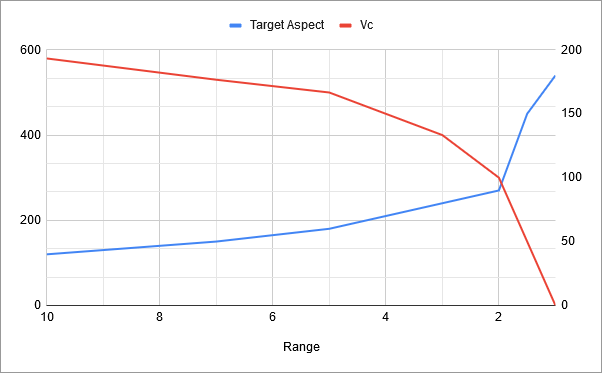 Matching the Gates described in the CT documentation is not always simple and when they are not closely followed there is a chance of overshooting. P-825/17 shows a table with relations between Range, TA and VC and suggests committing it to memory. Be aware of the fact that such a table may not be applicable directly to the F-14 and DCS and that the aircraft speeds may change (doctrine assumes a co-speed intercept), resulting in a different VC, especially at the entry point at 10nm.