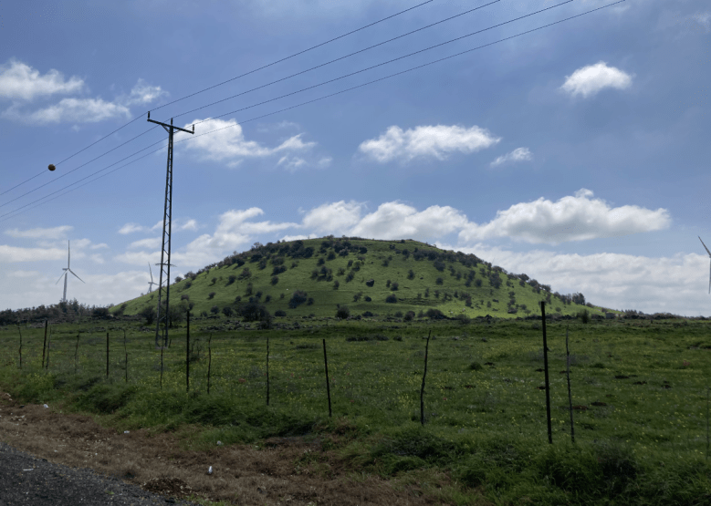 In the center/south parts of the Golan heights that’s a typical terrain: flat with distinct hills (Tels as we call them, not sure of the English term). Those are volcanic domes or volcanic mountains that are no longer active that bumps above the relatively flat terrain.