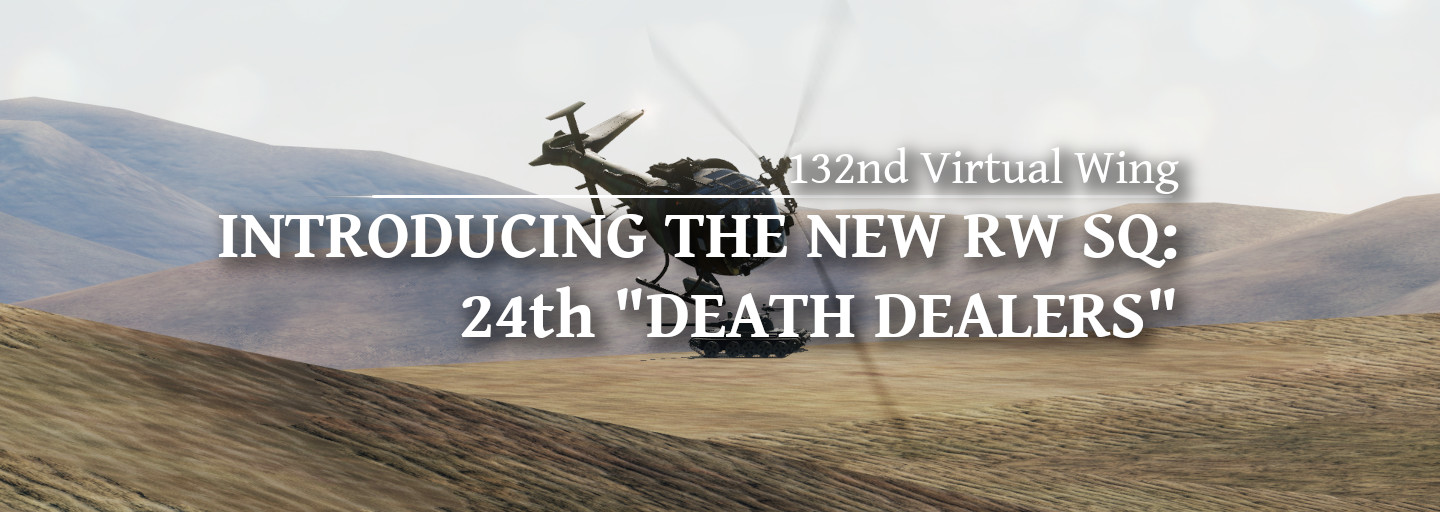 The 132nd Virtual Wing introduces a new squadron: the 24th Death Dealers. The 24th is currently flying the SA 342, but will move to the OH-58 Kiowa once the module is released by Polychop. The CO is Sly, and the recruitment should be opened soon.