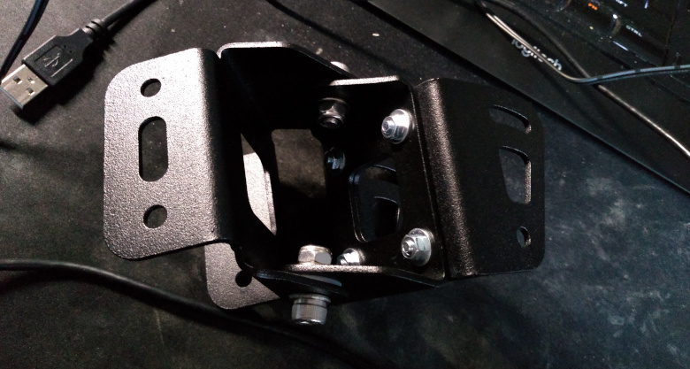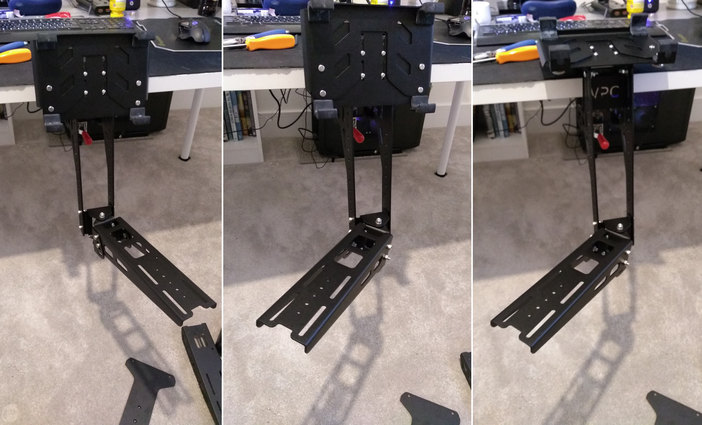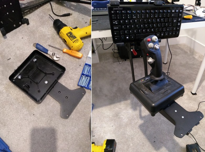 The resulting franken-mount allows adjusting the angle which the Fighterstick is facing, but also slew it vertically if necessary, so it can rest on the chair for example, for greater stability. It also allows the keyboard to be “flattened” in case it is not in use, or if it is simply more accessible in this position.