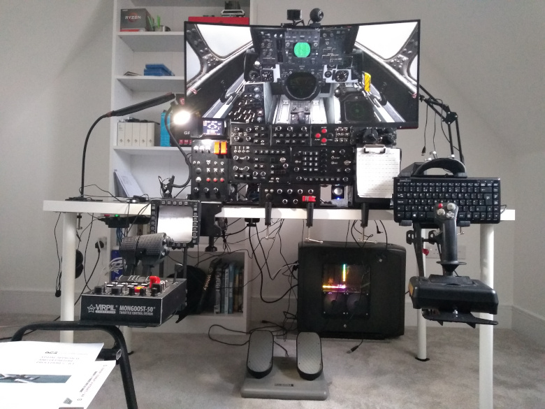 Since the release of the F-14, I had my Virpil T-50 located on the left and the Virpil Throttle on the right, although it is meant to be mounted centrally. However, although it is surprisingly comfortable to use, the extension is too long for the purpose of emulating the HCU. Thus, I decided to retire it, building an ad hoc solution centred on my almost 20 years old CH Fighterstick. The result is simpler to use, quicker and provide more buttons and controls, since the ones on the Throttle are now usable.