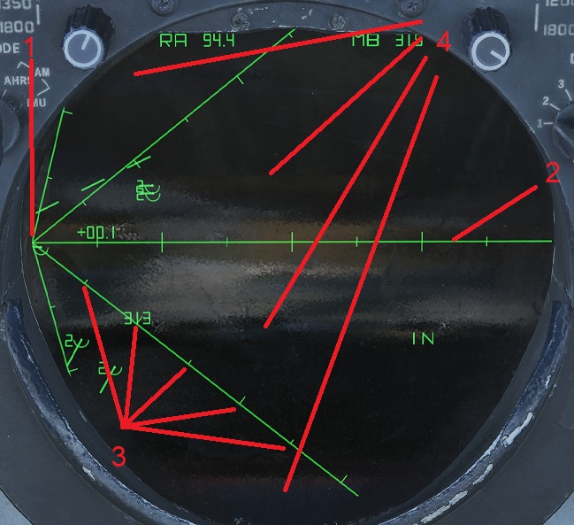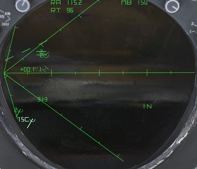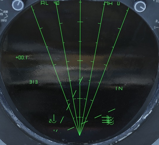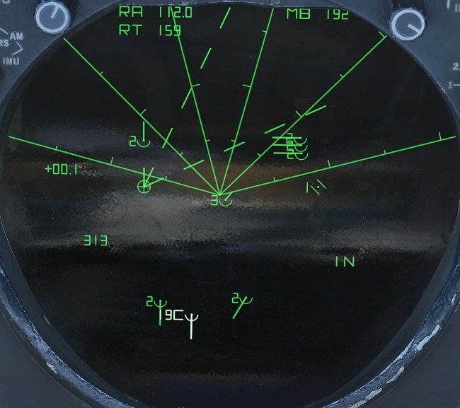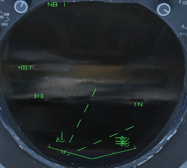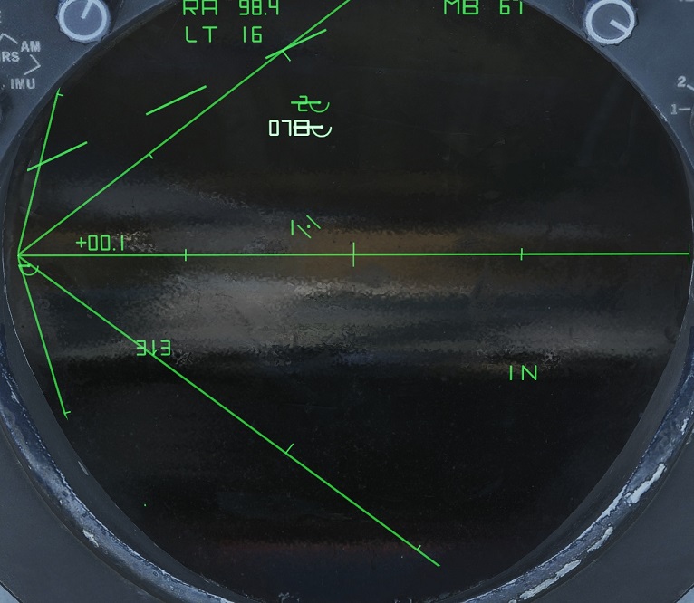 1. In this circumstance, the RIO has hooked a contact(symbolised by its brighter colour). At the top of the TID, a read out is produced, with range and magnetic bearing, in relation to YY(that being a bearing of 67 degrees and 98.4nm away from YY). In addition, a voice code is produced on the left hand side of the track, in this case reading ’07B’. A voice code indicates bearing from YY in tens(thus 67 degrees becomes 07), followed by a letter indicating range(A = 0 – 50nm, B = 50 – 100nm, etc.). The Voice Code’s appearance alternates with the track’s altitude. The Target Aspect reading remains in relation to ownship, and does not account for YY. Otherwise, like GND STAB, the datalink track shows its speed and true course via the vector.