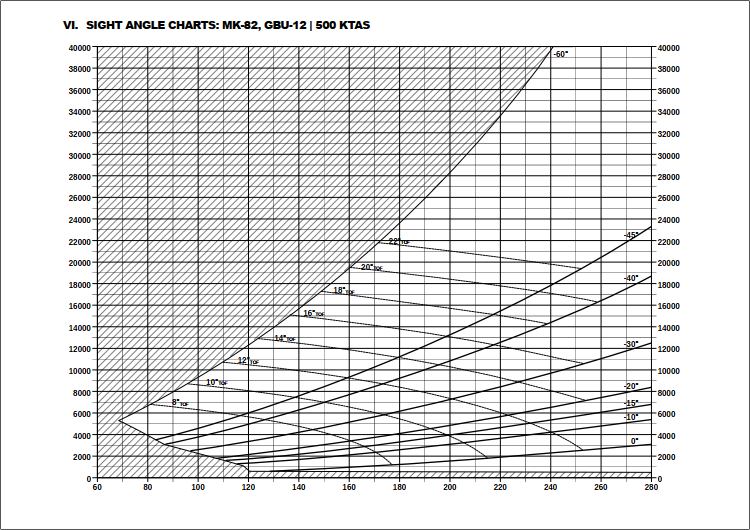 - Appendices: More Robert Shaw! Apparently you like the sketches about tactics and manoeuvres, so I added more of them. On top of that, I added a sample of new charts I’m remaking from low-res old sources. For now, the sight angle adjustments (mils) for Mk-82 and GBU-12 at 450 and 500 kTAS. I also imported a piece written by 132nd.LooneyT about IFF and the usage of this function in DCS through SRS and LotATC.