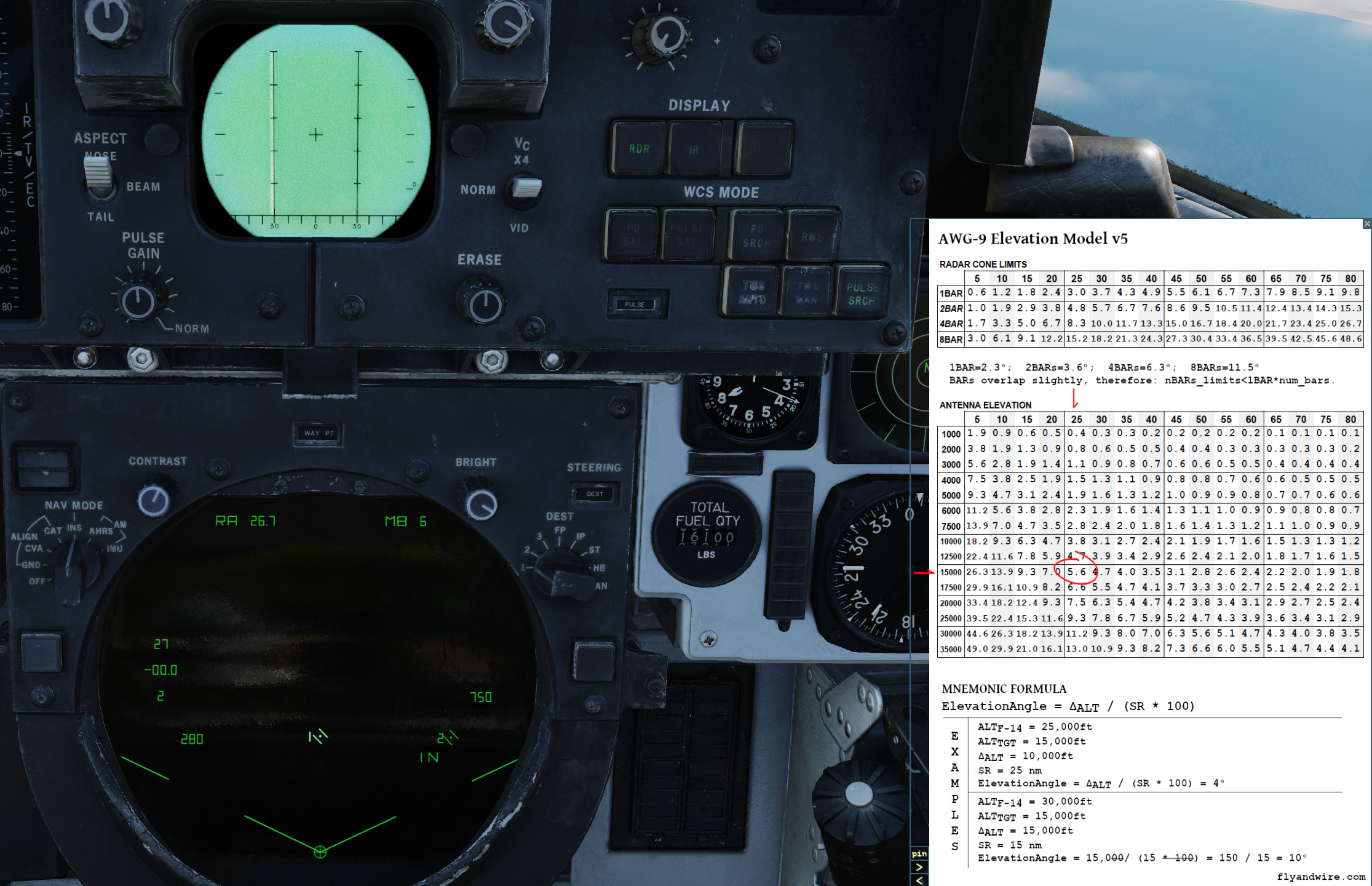 In this case, I used my in-game Kneeboard page to find the angle: the range from the waypoint is approximately 25nm, and the F-14 is flying at 15,000, so the angle is ~5.6°.