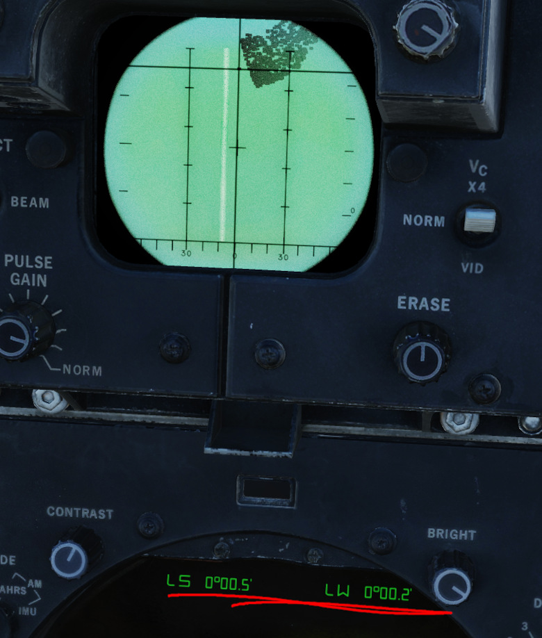 Radar is set to Pulse Search, 1 Bar. If the INS is not completely off the chart, using the distance from the waypoint can be a useful tool to pre-set the antenna elevation angle at a meaningful angle. This helps the process as 1 Bar is quite narrow, depending on the range.