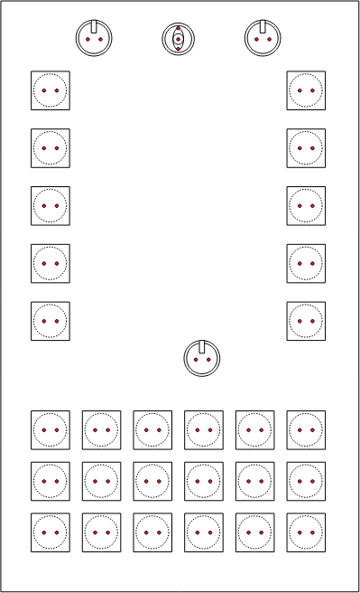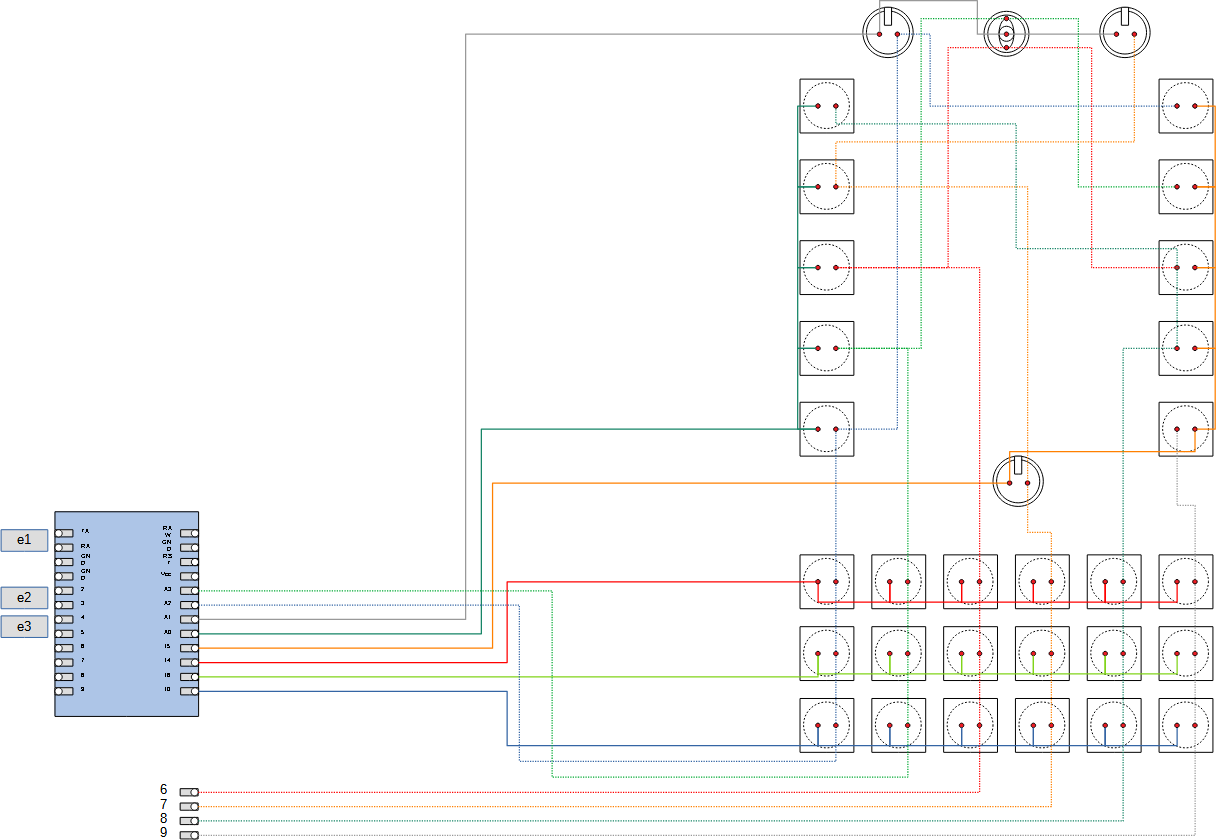If you have worked with a button matrix before, this diagram will looks incredibly simple to you. In fact, the 3×6 set of buttons automatically solve the wiring of the first three “X”, and provide a neat anchorage for the “Y”.