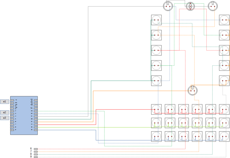 The number of buttons I need fits into a 6×6 matrix. This leaves 6 pins open. The easy solution is then filling the remaining pins with three encoders (you can never have enough encoders!).