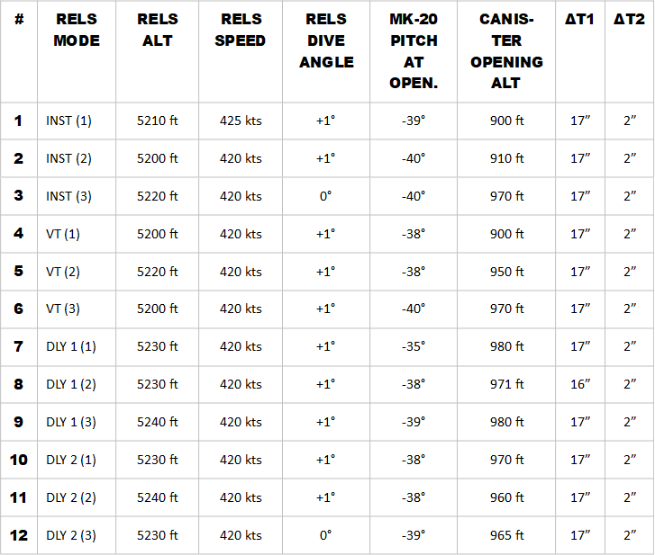 - Altitudes are AGL. Test #8 and #12 are level toss and dive toss deliveries (elevation ~100ft). In the other cases, the elevation of the targeted area is ~1100ft.