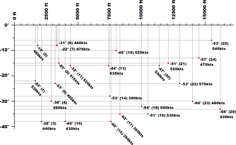 The impression is that, assuming constant release speed, the top-left part of the distribution is where the pitch angle is less steep. Moving towards higher altitude and steeper dive angles increase the Mk-20’s pitch, but for different reasons: