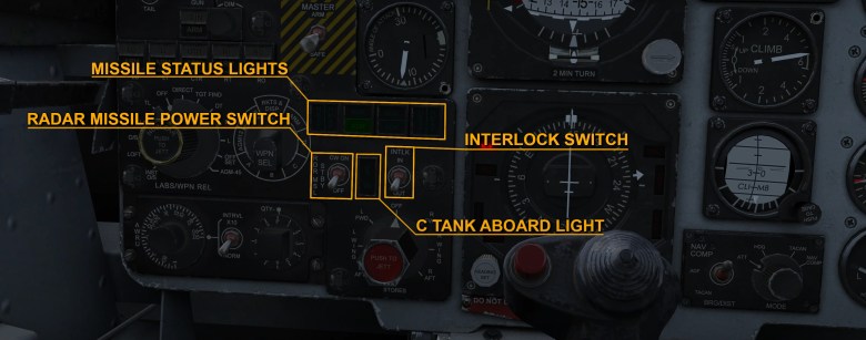 The Interlock Switch strictly affects the operation of the AIM-7 Sparrow. When the switch is set to the “In” position, a series of requirements are necessary for it to be employed, otherwise, it can be fired at any time. The “In Range” light must be on. The AIM dot is inside the ASE circle. And the radar display knob is not in the V I mode.