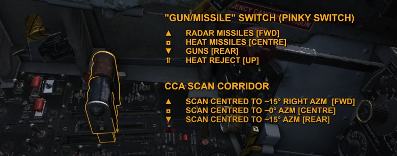 In certain versions of the F-4E, the pinky switch also controls the radar scan corridor for the CAA mode, acronym for Computer Automatic Acquisition mode. The details of this mode will be discussed in the future. In particular, the rear position (used for guns), centres the slewable scan at about 15° azimuth. In the centre position (used for heat), the scan is centred at about 0° azimuth. Lastly, the forward position, centres the scan area at about 15° right azimuth.