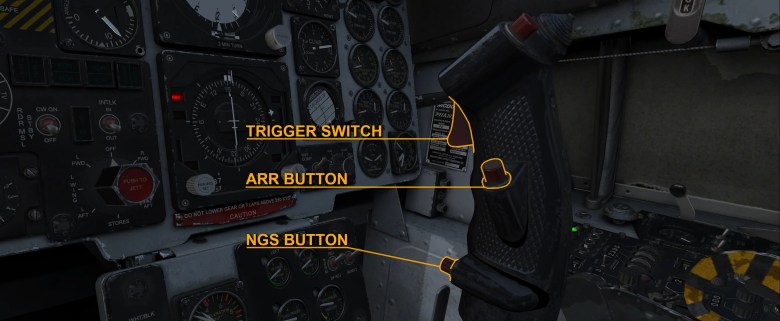 Besides the double-detent trigger, the control stick hosts two additional functions. The Nose-Wheel Steering, sometimes called Nose-Gear Steering, enables the radar auto-acquisition mode. The AAR, acronym for Air Refuelling Release button, uncages the seeker for the AIM-9 or the AIM-65 missiles.