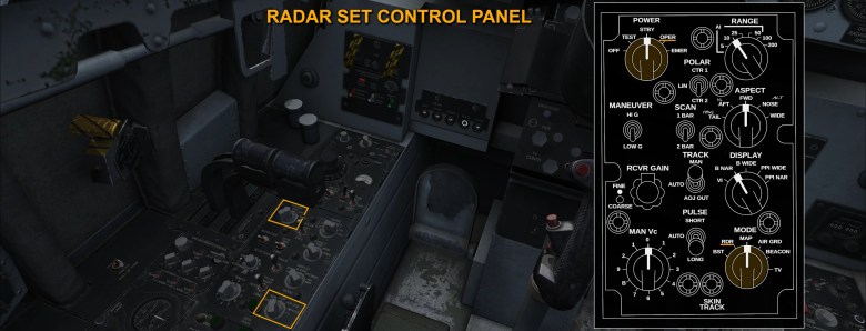 The Radar Set Control Panel is located in the back seat. It somewhat resembles the Sensors Control Panel of the Tomcat, and similarly, it contains several radar-related controls.