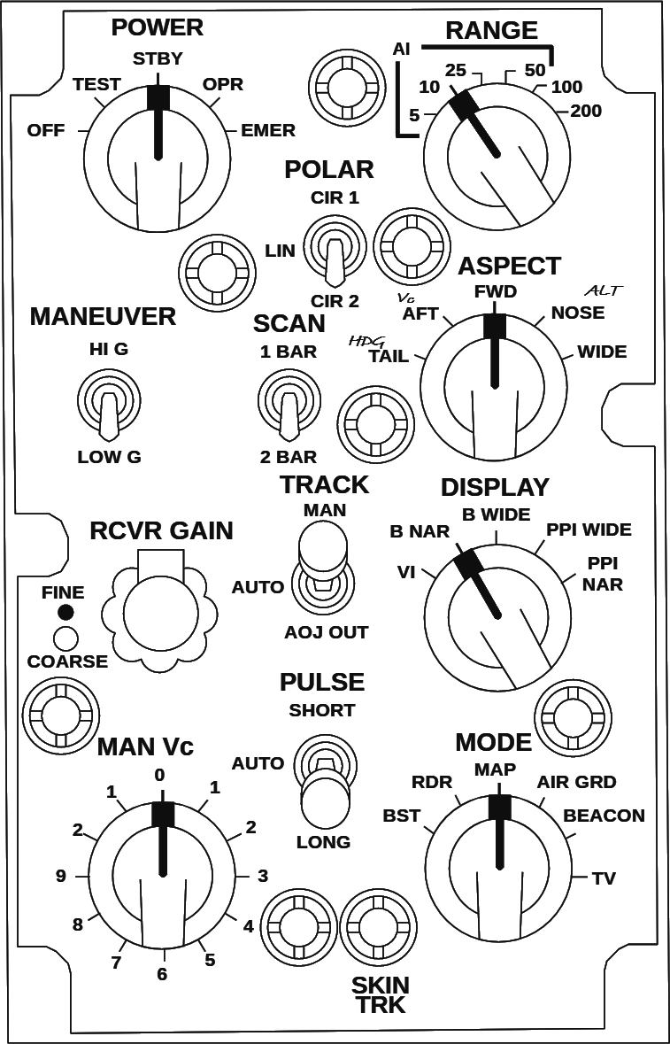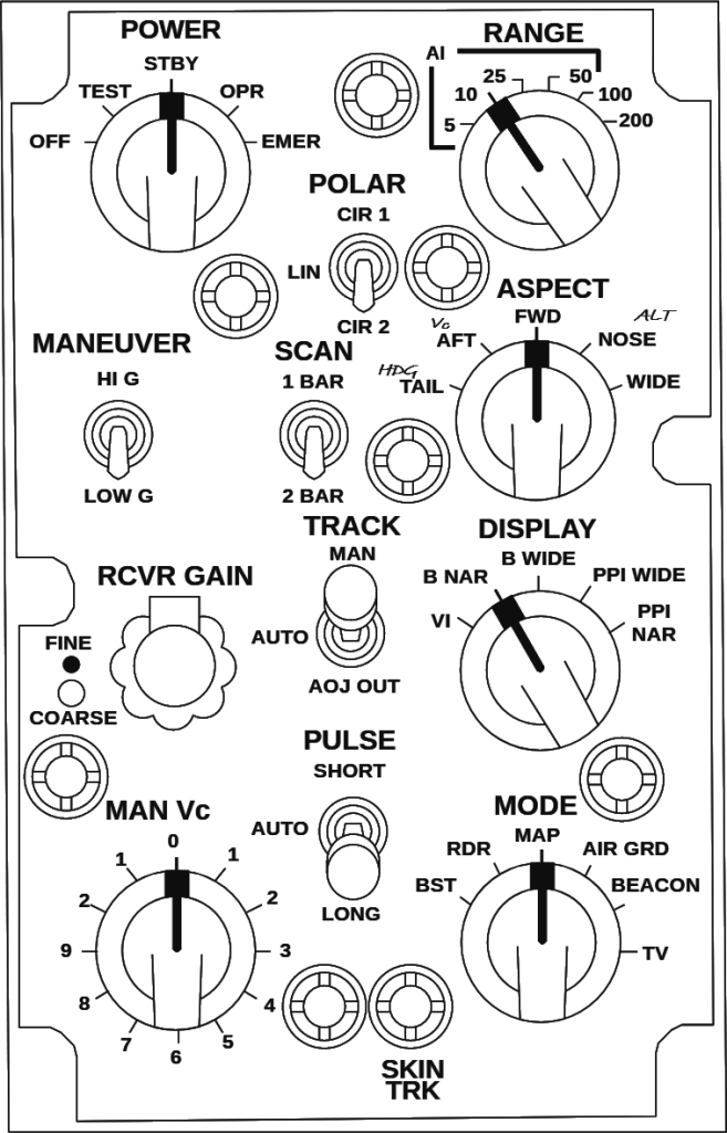 The last control is the Radar Mode knob. This 6-position knob allows the WSO to select the main radar modes of operation. Each mode also has a number of submodes, but those will be discussed later.