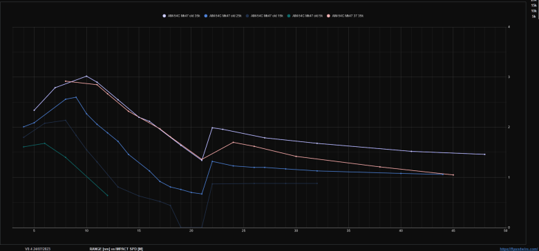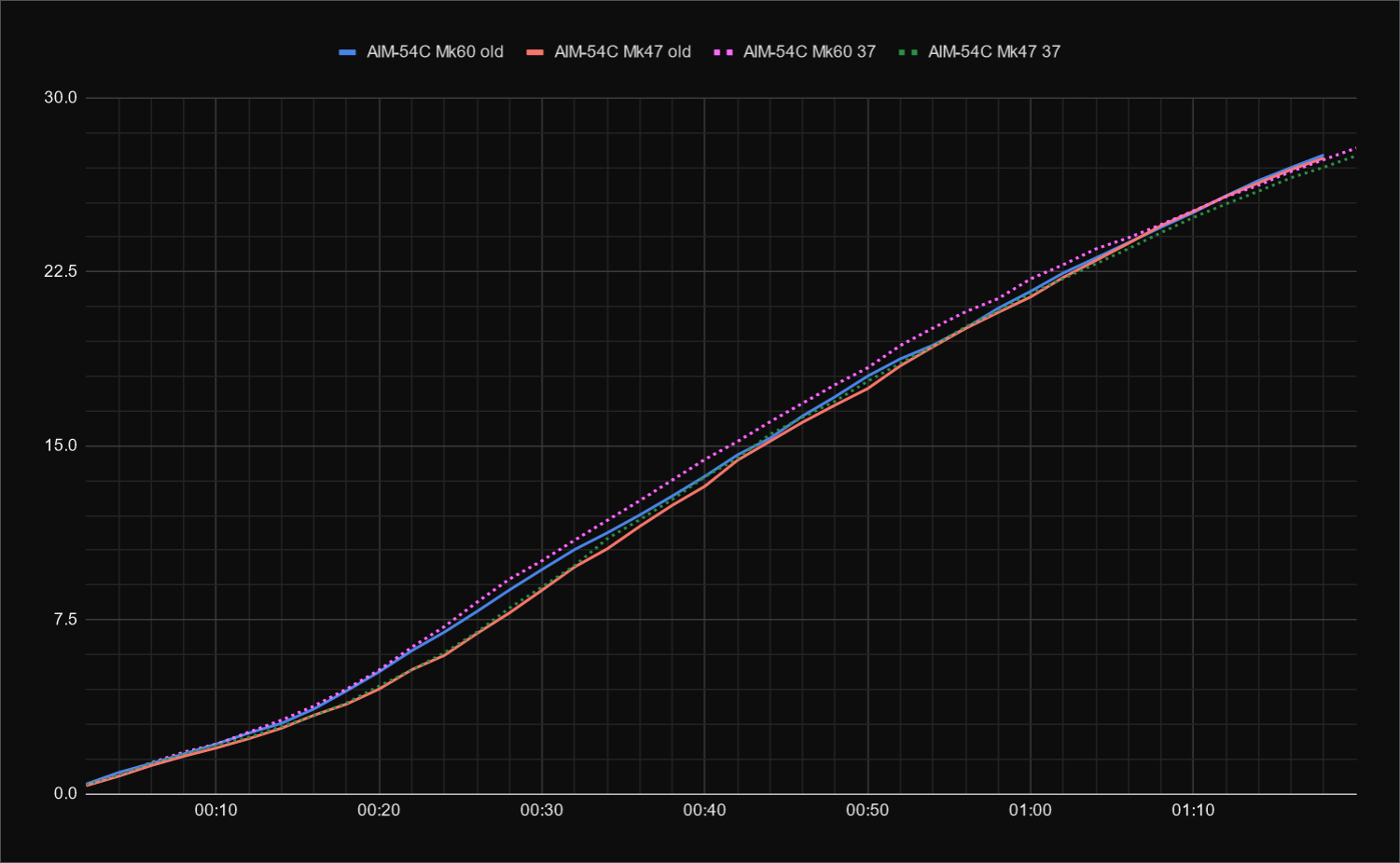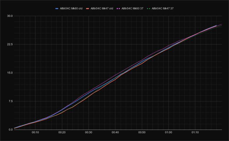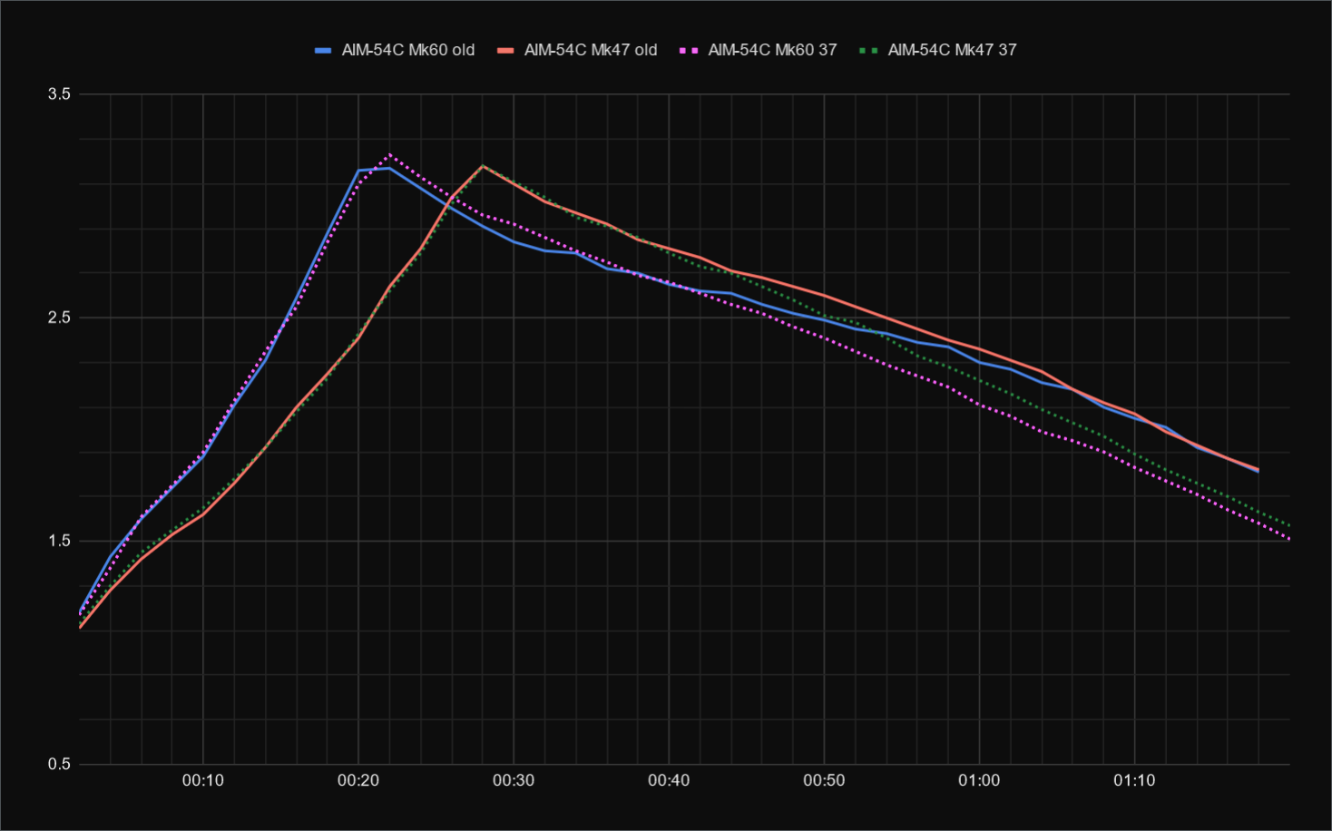 The performance in the no-loft region is identical, but as soon as the loft kicks in, something goes wrong and the missile loses energy quite rapidly. Looking at the datapoints I collected, it seems that the characteristic cruise region where the missile maintains speed before diving, and sometimes accelerating, has been severely affected.