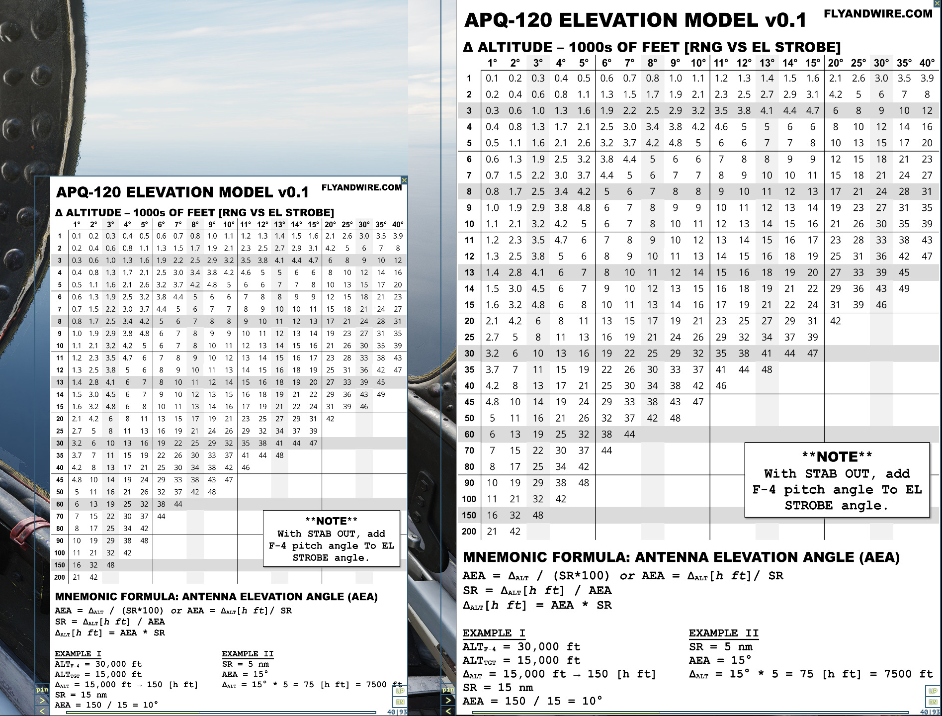 The second page is fundamentally the inverse of page one. It can be useful to assess the target’s altitude when a return is spotted on the radar display. For example, if the antenna is looking up by 3° and the range is assessed, using the display scale and the reference grid, to be circa 20 nm, then the altitude is 6,000 higher than our Phantom. This information can be broadcast to other flights or Controllers.