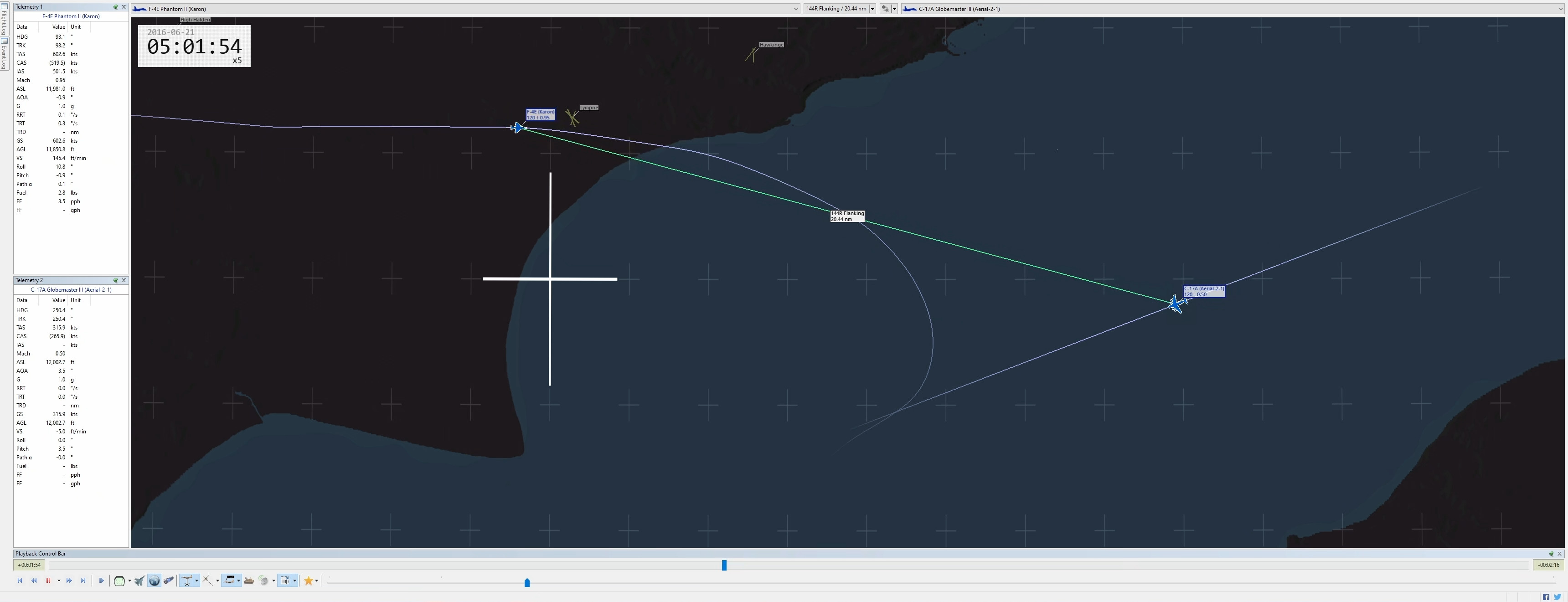 TacView better shows the intercept. Two things worth mentioning. In primis, I purposely set a slow-flying target and cranked the throttle close to Military to create a vast speed difference. This proves how this technique works even outside the usual 5:4 speed ratio. In fact, here, the ratio is almost 2:1: Mach .95 for the Phantom and M.5 for the Globemaster. It goes without saying that a proper intercept requires throttle management depending on the task, such as VID, tanker rejoin, et cetera.