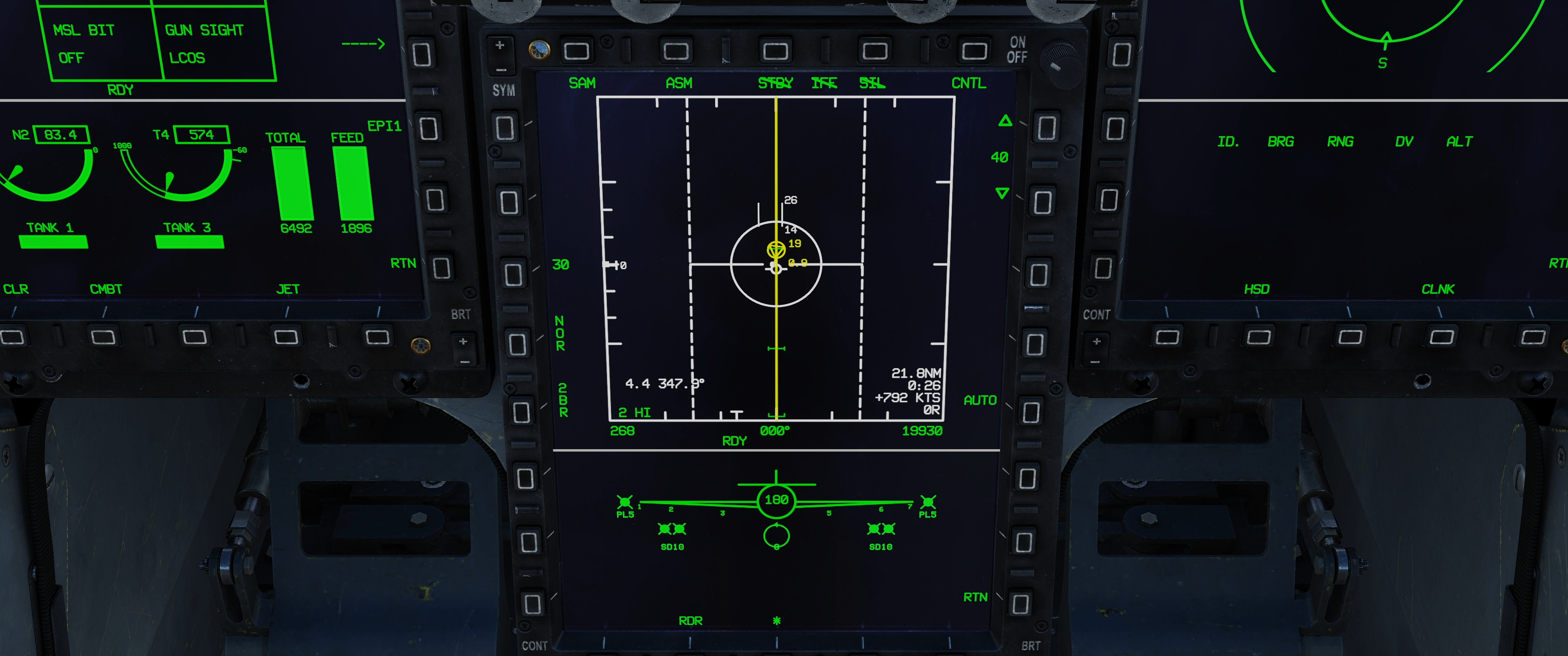 SAM provides two submodes, ASM and NAM, acronyms for Automatic Situational Mode and Normal Awareness Mode. The main difference between the two is who has control over radar parameters such as bars and azimuth. In ASM, those variables are automatically adjusted by the FCR system to increase the target refresh rate. In NAM, instead, the pilot has greater control over the radar parameters.