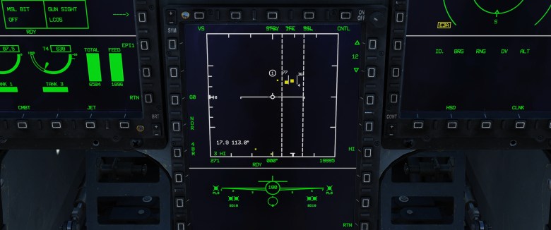 Before wrapping this up, I noticed that the KLJ-7 FCR of the JF-17 enters a peculiar mode when the **acquisition button is depressed. This mode, often called “supersearch” in many other modules, forces the azimuth to a very narrow interval, whilst the bars are extended. This mode is particularly handy as working with azimuths is usually simpler than elevation.