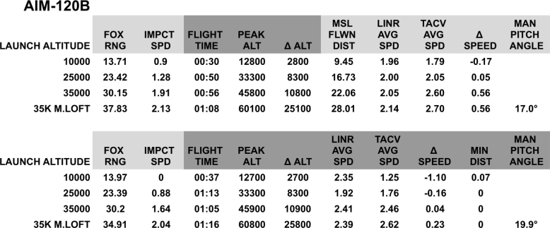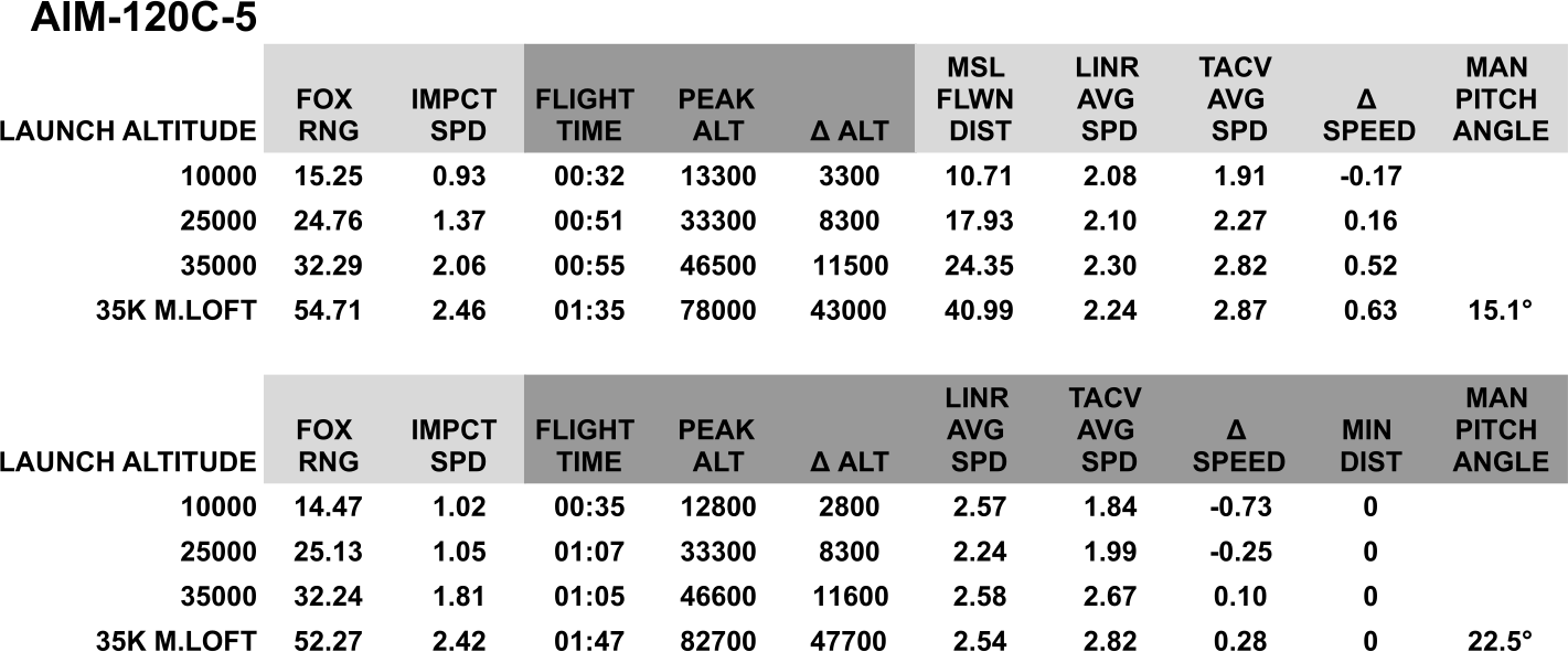 - “Manual pitch angle” represents how much the fighter pointed upwards when launching. Previous studies have highlighted how beneficial manual loft is and the shortcomings it can cause. Note that this angle is not the best-case or most efficient loft angle for each specific missile.
