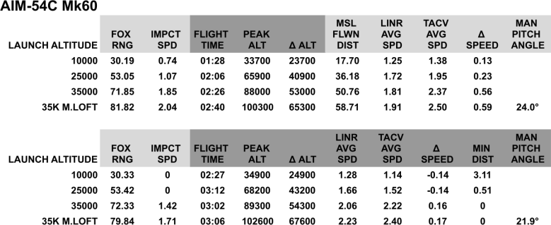 The numbers discussed in this study should have given a general idea of how far and dangerous a missile can be in various scenarios. More importantly, since the launching conditions are the same, we can obtain a sort of “baseline impression” of them. We now better understand, for example, which missile can be a threat at what range, how effective simple geometry changes can be against it, and a general idea of how each missile behaves at different altitudes.