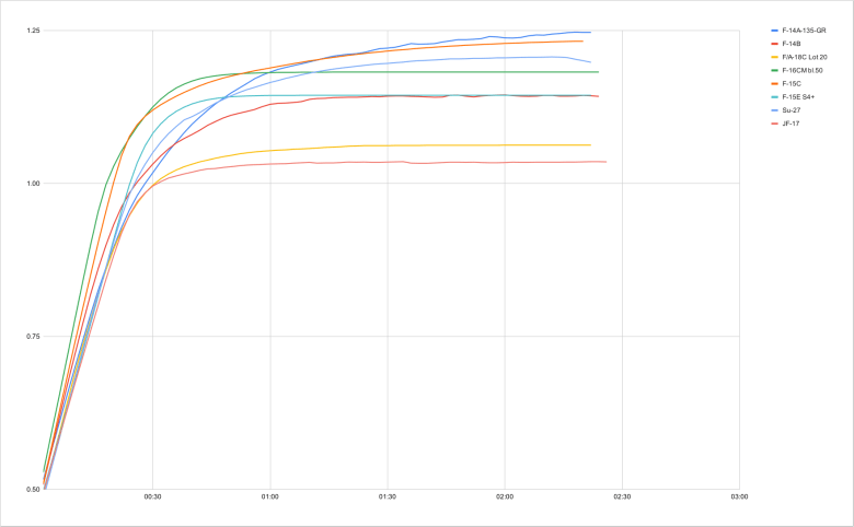 At 30,000ft, the top speed after a defined amount of time is the F-14A’s Mach 1.86. The Fighting Falcon touches Mach 1.79, and the JF-17 Mach 1.58. It is when the payload is introduced that the situation drastically changes. With a fairly standard loadout, the Tomcat hits Mach 1.46, the Falcon Mach 1.52, but the JF-17 languishes at Mach 0.97 in level flight. A competent pilot can help the Thunder cross through the transonic region, but the point stands: the energy the F-16 can “gift” to the AMRAAM is superior in almost all conditions.