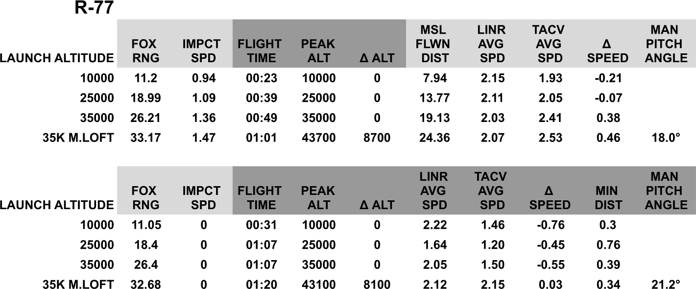 Manual lofting considerably helps the R-77, providing a certain amount of altitude to be reinvested into energy. However, as the numbers show, a manual loft can provide a greater range but may not be sufficient, especially when the target manoeuvres.