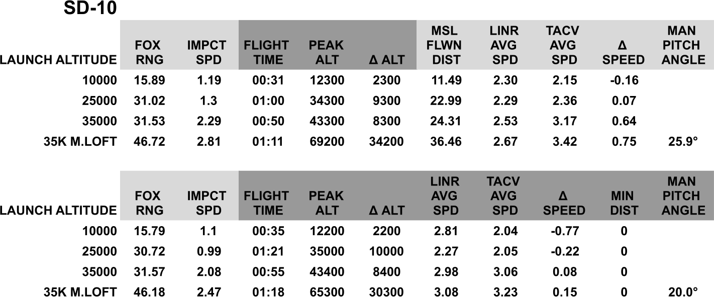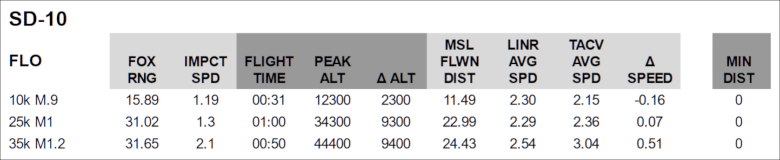 Two points are worth raising: consistency and good performance. The SD-10 managed to splash their target at reasonable ranges in any scenario. Interestingly, the FLO at 25,000 or 35,000 feet is fundamentally unchanged. Observe, in fact, how the flight time decreased at high altitudes and the impact speed increased by a solid 40%.