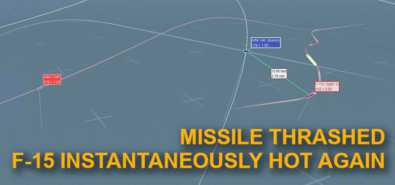 Have you seen that? No, I don’t mean the notching, we all know the AI is way too good at that. I meant how the F-15 turned hot again the nanosecond the missile went dumb. Let’s watch the action again. This is the moment the missile is thrashed. The AI has stopped chaffing and it started the turn. How is this possible? The AIM-54’s seeker is still active. From the F-15’s perspective, there is no way to know with such precision that the missile is now dumb.
