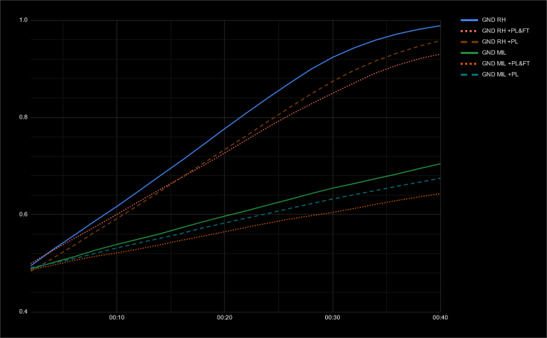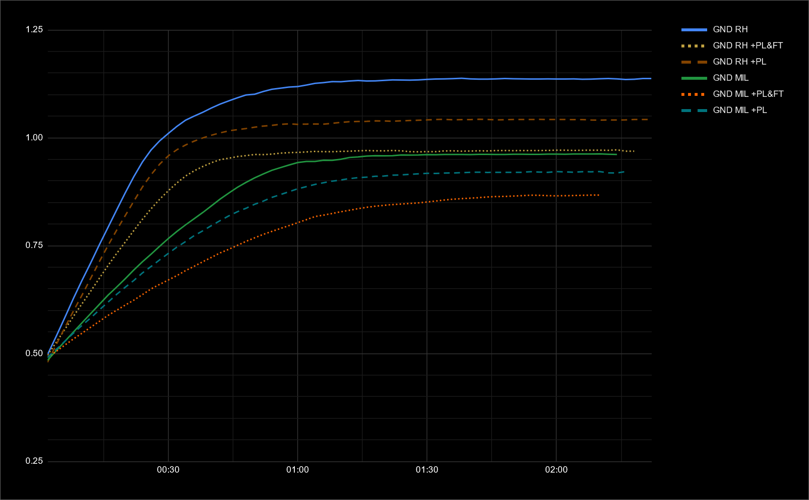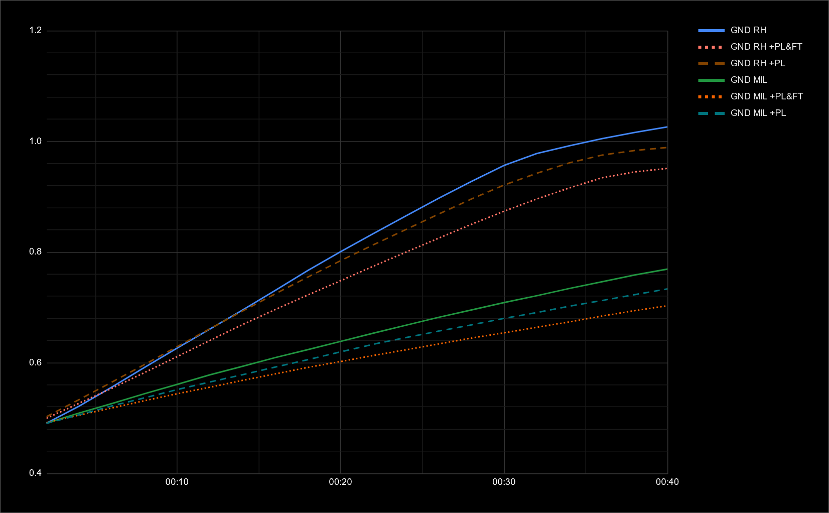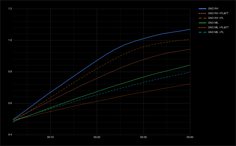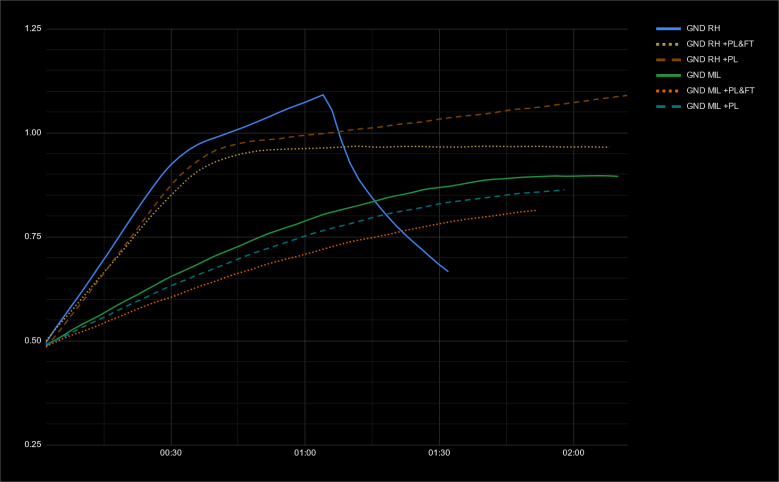 The 40-second details show three different groups of results: the clean reheat test skyrocketed away, leaving the payload and payload plus fuel tank configurations close together. At Mil power, instead, clean and payload behaved similarly, but the payload plus bags setup lagged behind.