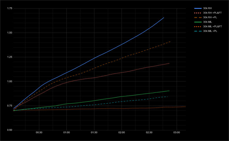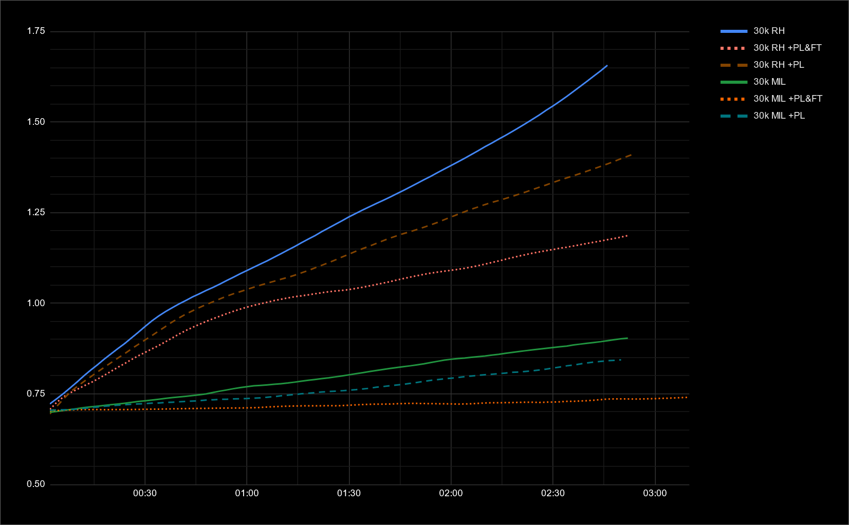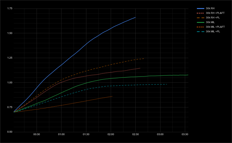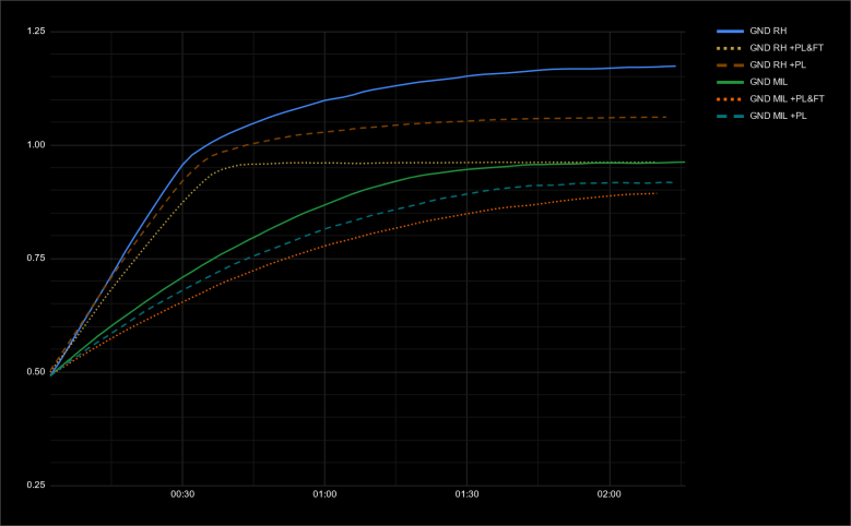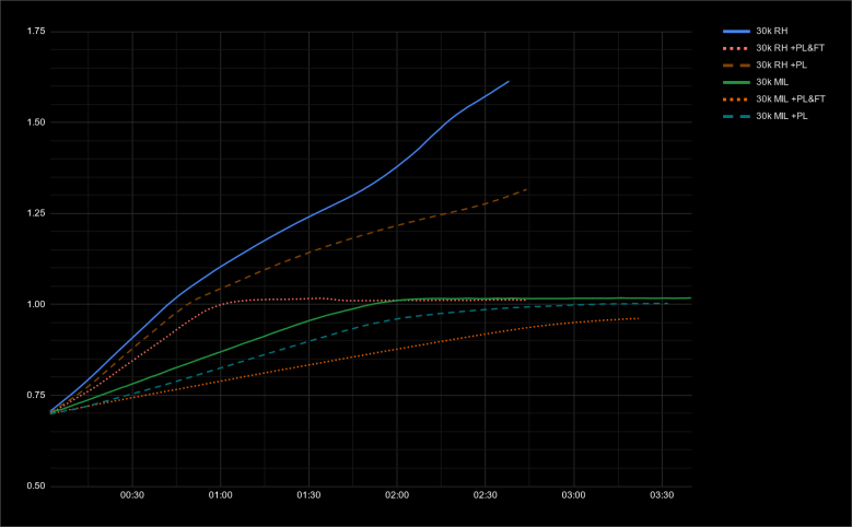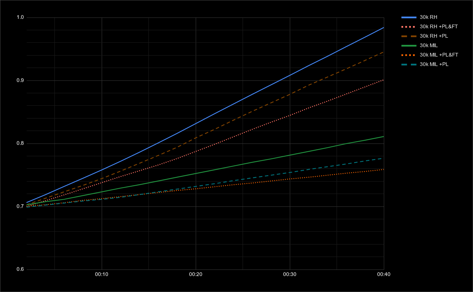 The 40-second details show three different groups of results: the clean reheat test skyrocketed away, leaving the payload and payload plus fuel tank configurations close together. At Mil power, instead, clean and payload behaved similarly, but the payload plus bags setup lagged behind.