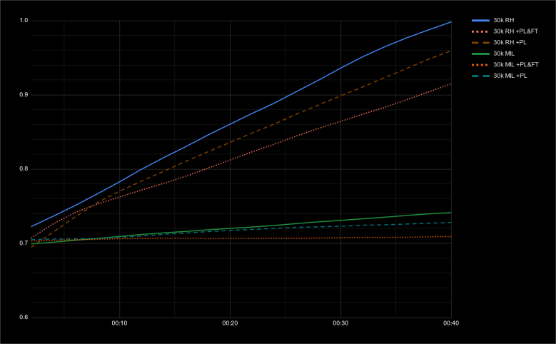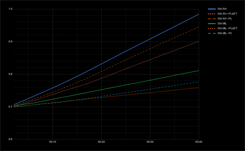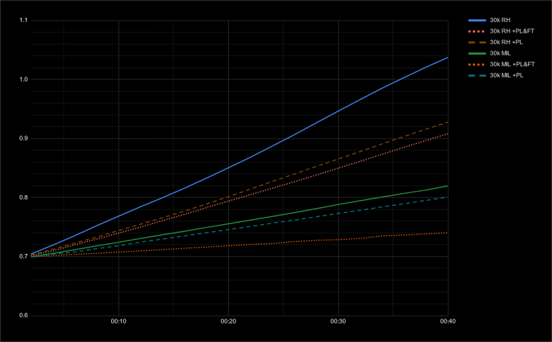The curves at 30,000 ft are some of the most peculiar discussed so far. When reheat is used, the three configurations almost mirror each other, the “payload” set up as a sort of bisector. The clean Mirage F1 is extremely fast, de facto unaffected by the transonic region. At the end of the data-collection period, it shows no signs of slowing down at all.