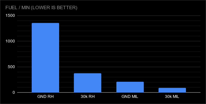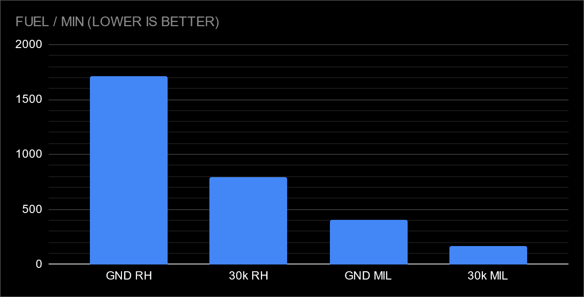 Fuel-wise, the Atar 9K dash 50 shows the most unusual results. This engine seems efficient at high altitudes, whereas it is poor at best down low when reheat is used. The fuel consumption at low altitudes is, in fact, 360% compared to 30,000 ft. In the military thrust setting, the endurance increases considerably. Nevertheless, the Atar still uses more than twice the quantity of fuel at low altitudes compared to up high.