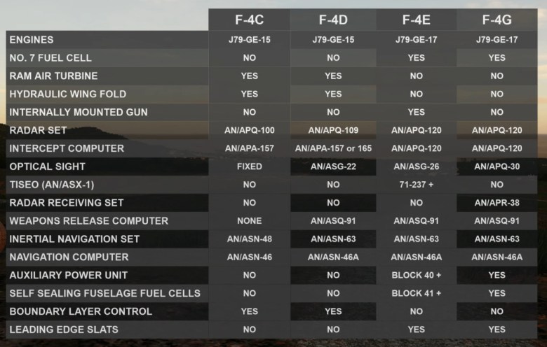 The F-4 II entered US AF service long before the mentioned date. This table shows some of the differences between the F-4C up until the F-4G (from Guns and Slats: F-4E Peculiarities – Phantom Phamiliarisation II).