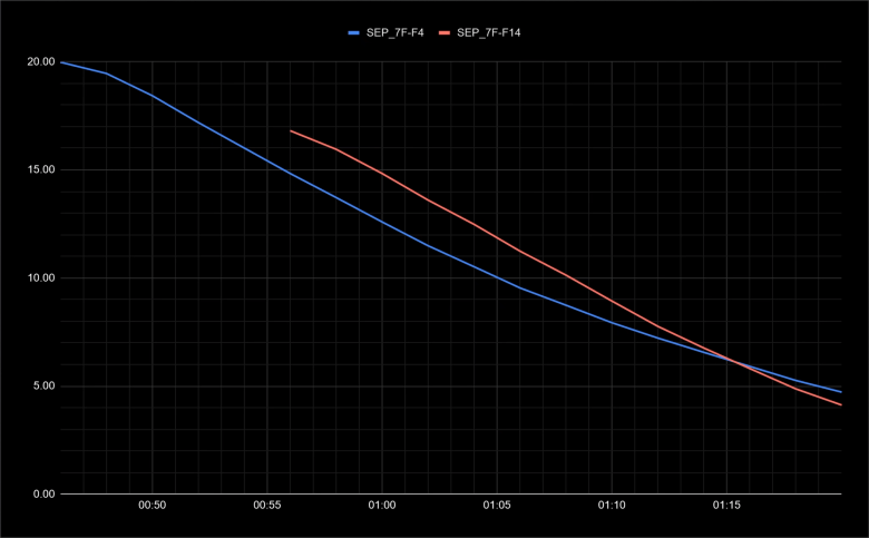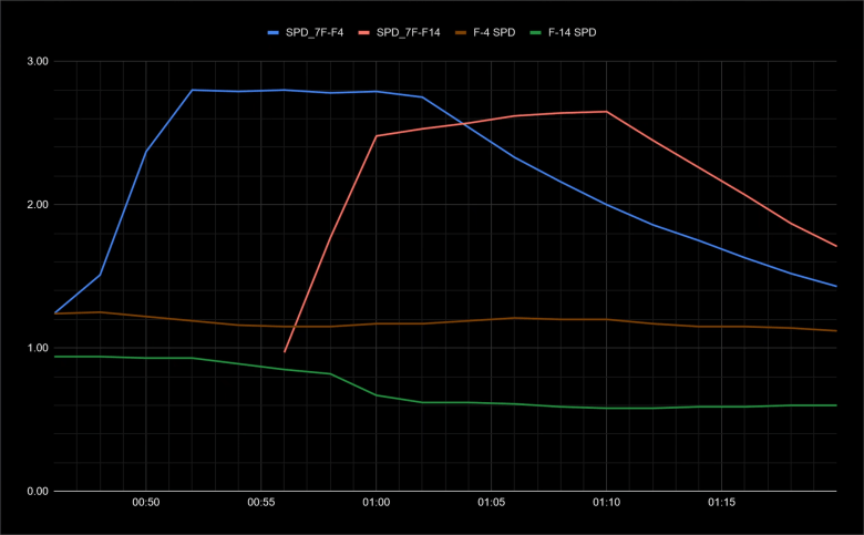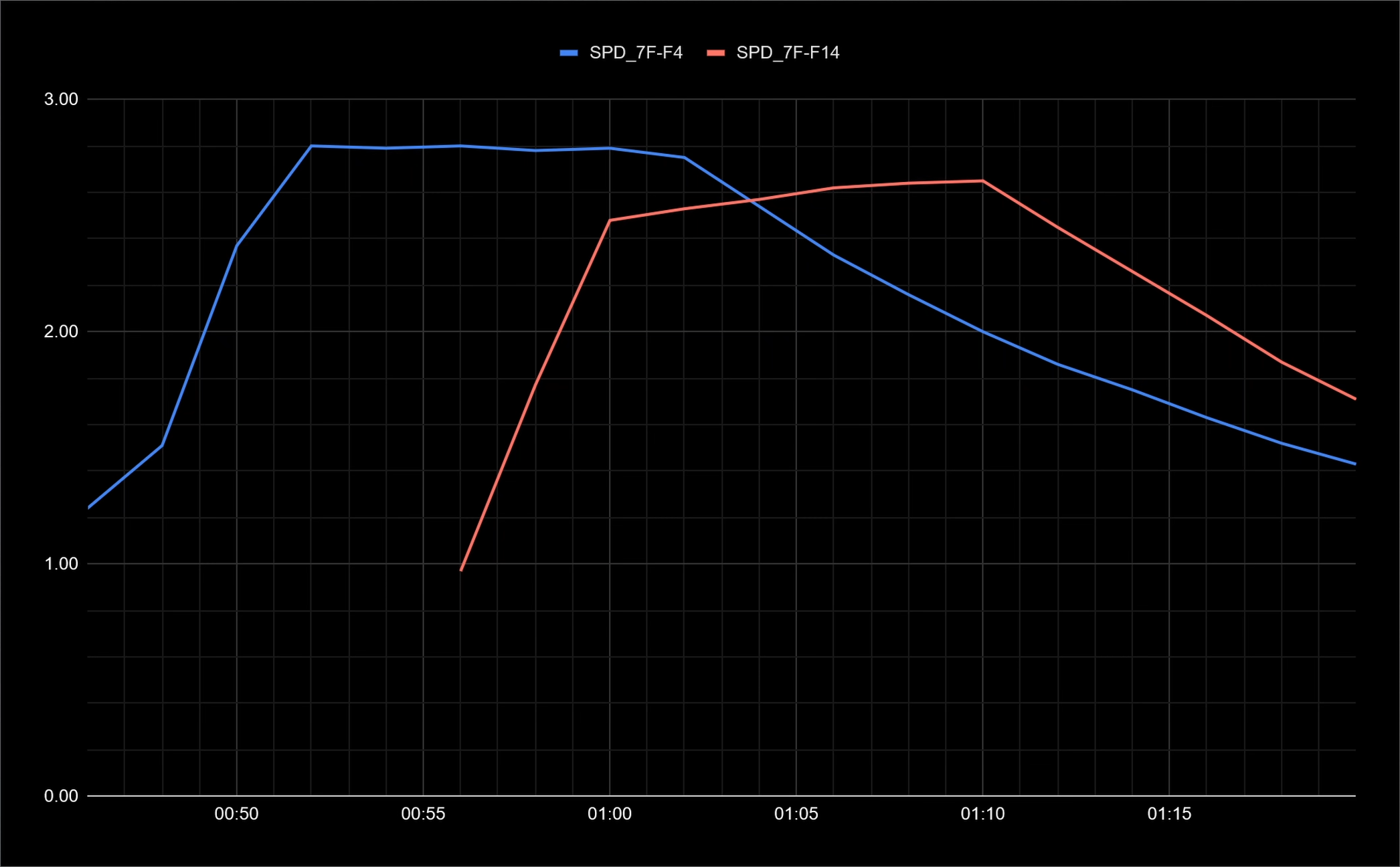 Plotting both the fighters and the Sparrows’ curves together, from the first launch to the second missile thrashed, we see a few more interesting details. In primis, the speed of the F-4’s Sparrow remained somewhat stable even during the hard turn at the beginning of the crank. In other words, as long as the dual-thrust rocket motor was running, the Sparrow maintained a stable cruise speed.