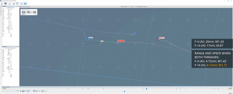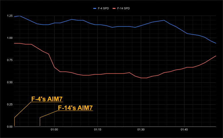 This chart represents the separation between missile and target over time. In other words, a distance equal to zero means that the AIM-7 connected. Neither did in this case, but the role reversal, so to speak, is appreciable at timestamp 1:15. If we add the fact that the Tomcat’s Sparrow was faster than the Phantom’s at the end of the chart, we can conclude that the 20nm employment by the Phantom was not an optimal choice, the plethora of issues from the F-14’s side notwithstanding.